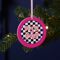 A pink circular ornament features the phrase "Merry & Bright" in a lively checkered pattern, finished with a ribbon for easy hanging. The cheerful design is complemented by gentle pastel tones, capturing the joyful spirit of the season.