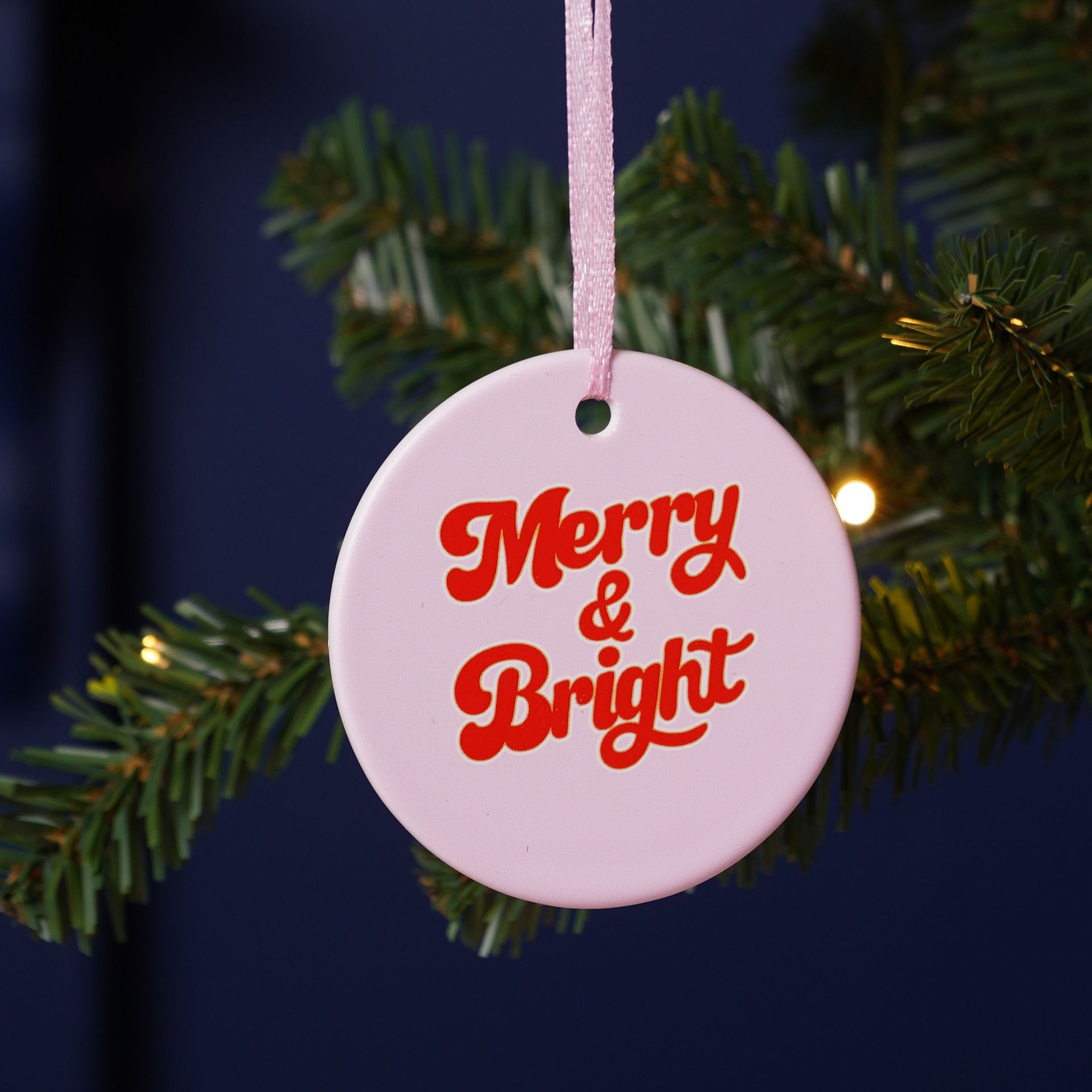 A round, white ornament with the text "Merry & Bright" in red lettering hangs from a soft grey ribbon, offering a crisp, modern look. The playful script and classic colour pairing evoke the warmth and nostalgia of holiday traditions.
