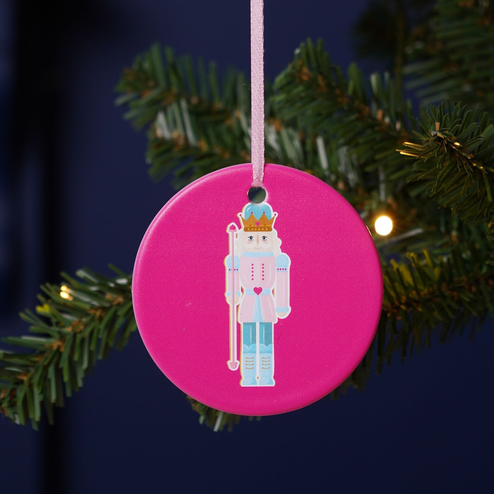 A pink circular ornament features a cartoon-style nutcracker figure, with a handy hanging ribbon. The cheerful character capturies the joyful spirit of Christmas with a sweet, nostalgic twist.