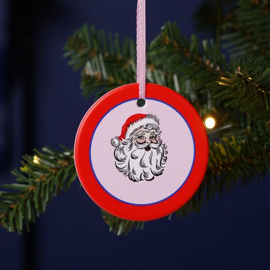 A red circular ornament featuring a Santa Claus illustration hangs from a ribbon, its cheerful details enhancing the tradition of Christmas decorating. The smooth ceramic contrasts with the soft ribbon, adding texture and charm.