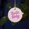 A white circular ornament with the text "Santa Baby" in pink lettering.