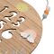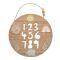 The wooden, circular plaque showcases a die cut numbers and colourful designs. The plaque is designed for wall hanging using the attached pom pom rope hanger.