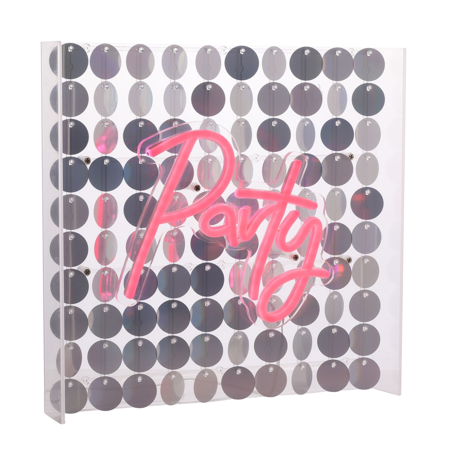 The Signography Neon Collection Wall or Mantel Signs bring a bold, modern twist to home décor with vibrant neon-style lettering set against a shimmering background.