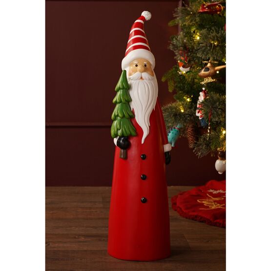 A festive Santa Claus figurine in a bright red coat and hat, holding a small green Christmas tree, is crafted with a smooth magnesia finish for a modern, cheerful look. Subtle textural details and bold colours add a fresh sense of fun to outdoor displays.