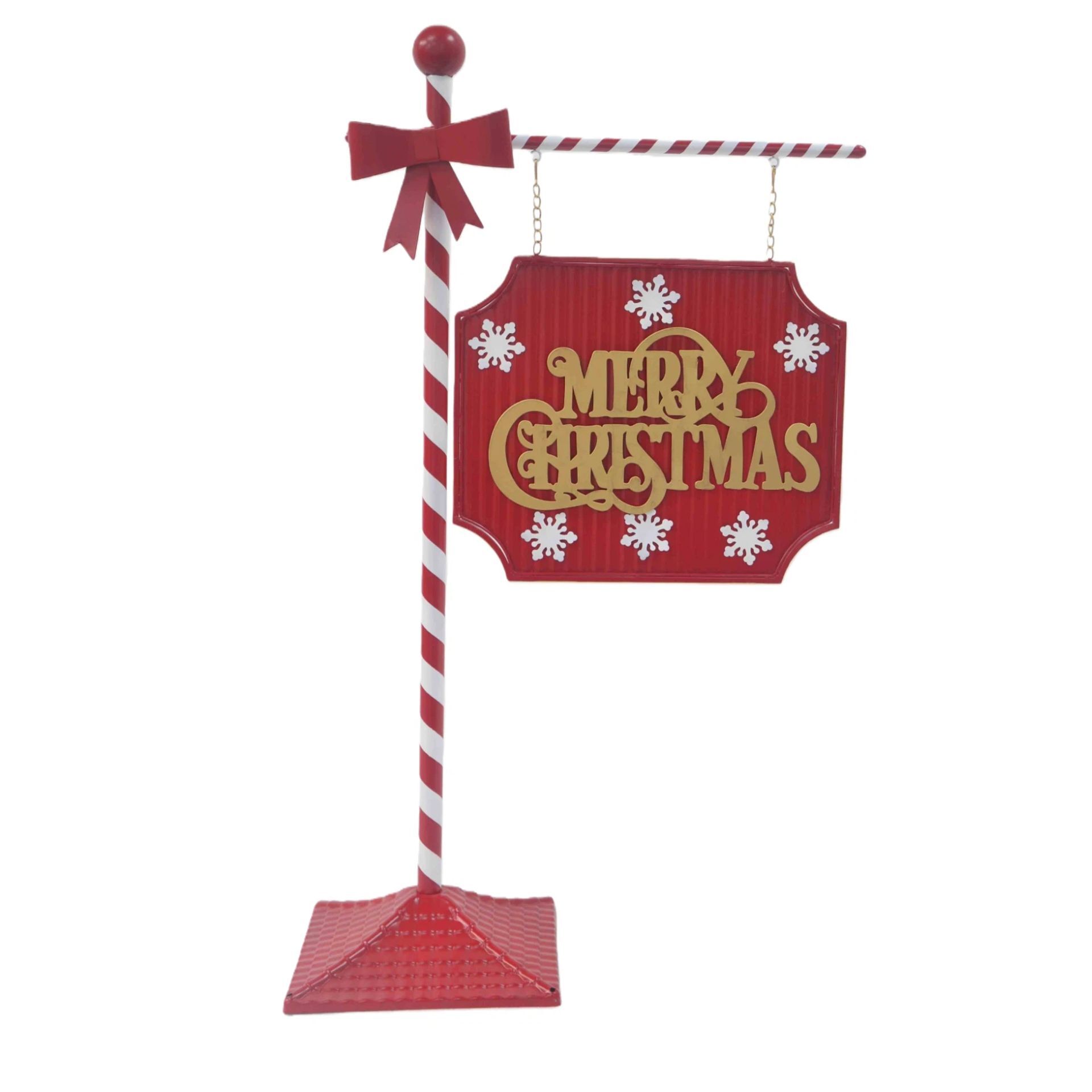 A red and white wooden sign with the text "MERRY CHRISTMAS" and snowflakes, hanging from a candy cane-striped pole, creates a cheerful focal point.