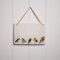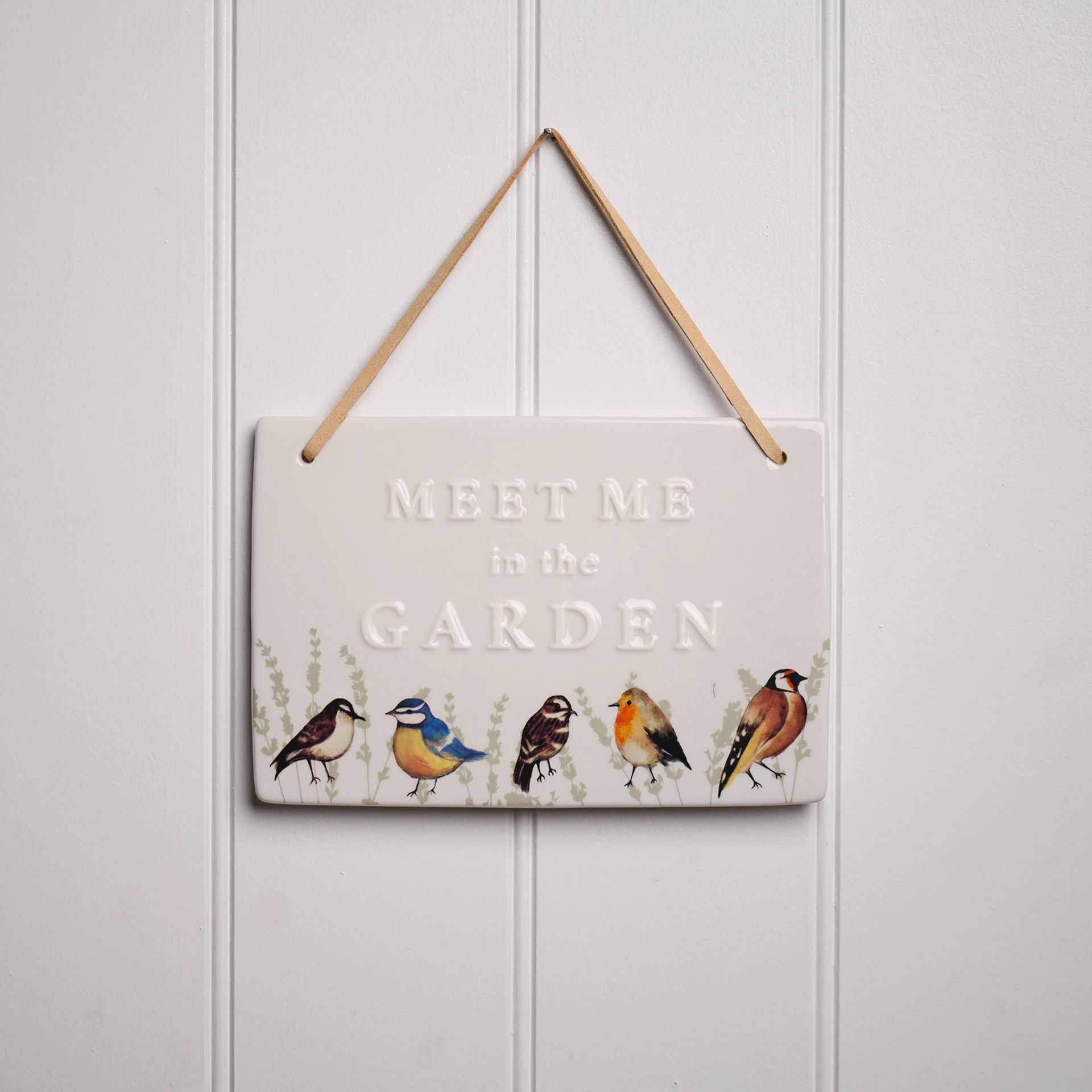 The ceramic plaque showcases a gloss finish, complete with off-white colouring, embossed 'Meet Me In The Garden’ title and colourful printed bird illustrations. It is designed for outdoor display using the attached leather hanger.