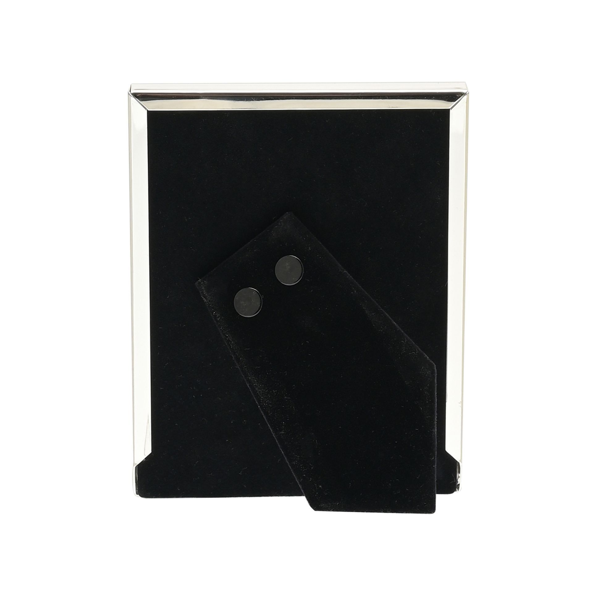 The metal plated frame showcases a shiny metal plated finish around its heart shaped aperture. It is designed for portrait display using its attached standing strut.