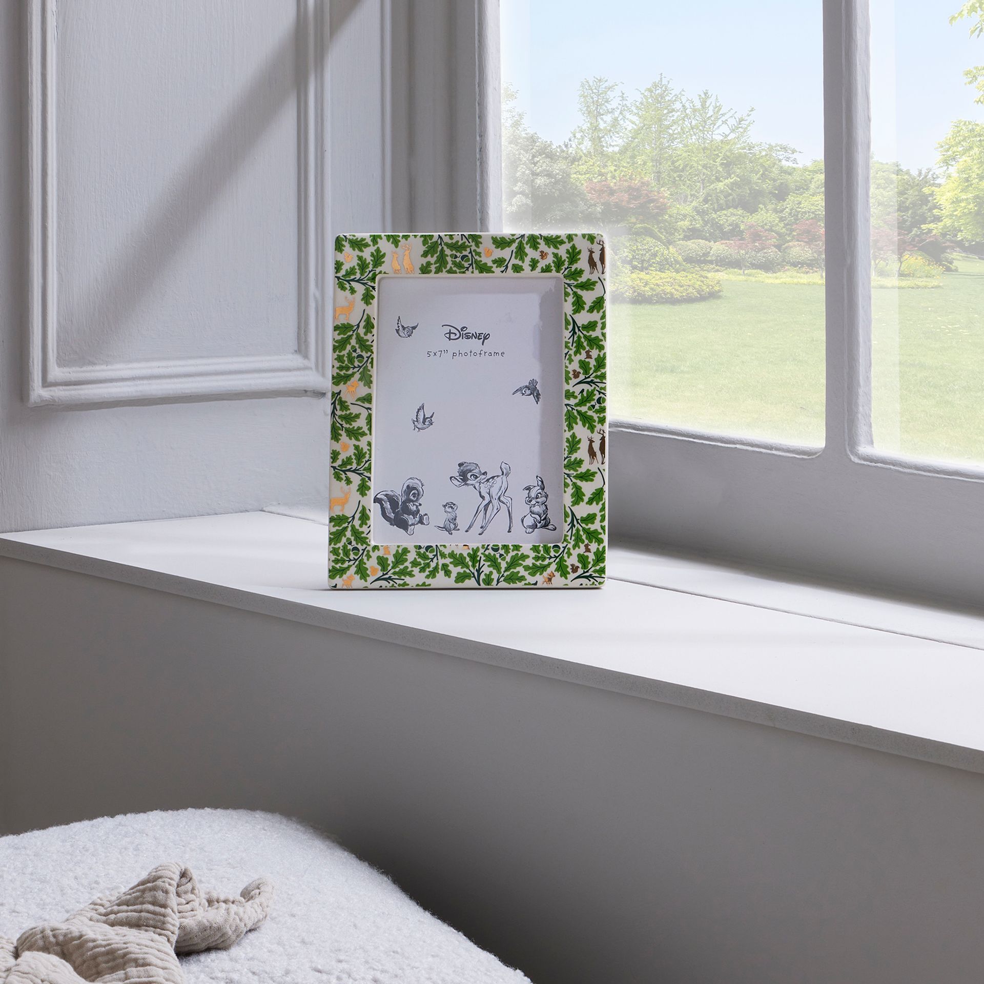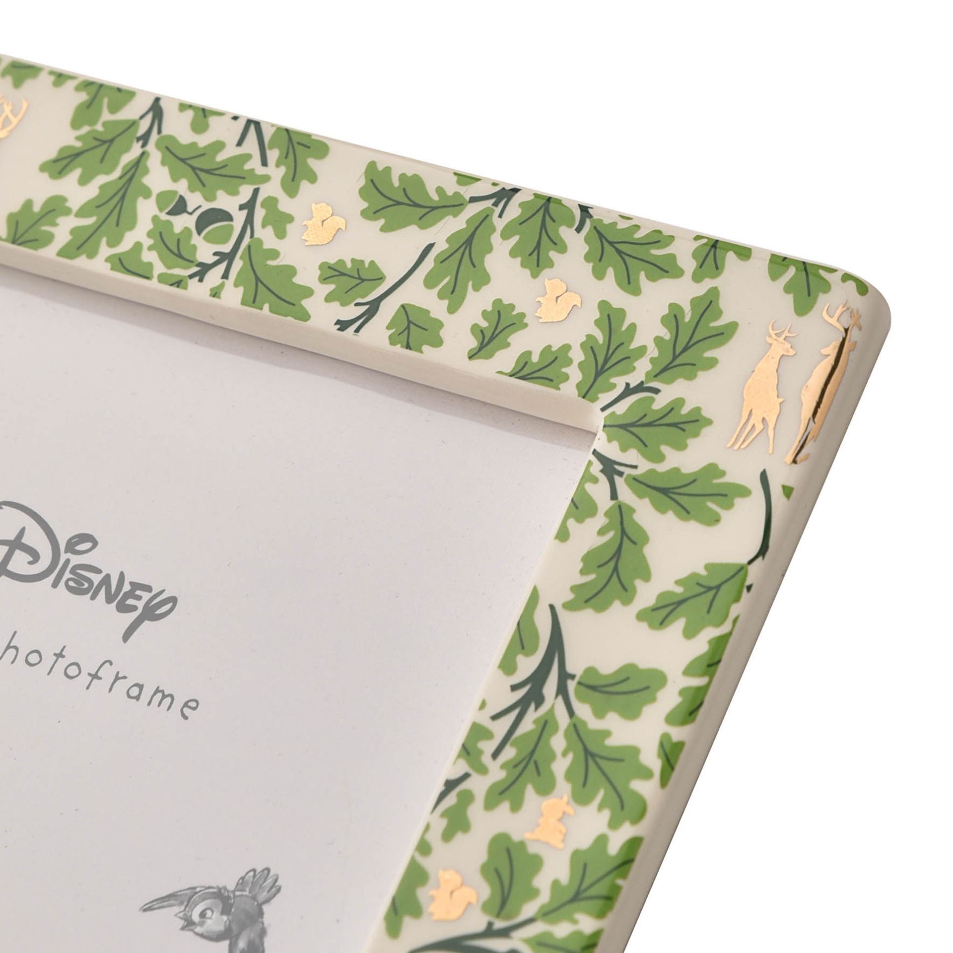 The ceramic frame features a colourful printed design of leaves and acorns upon its white colouring, which is enhanced by gold foil silhouettes of Bambi characters. It is finished with luxury black velveteen to the rear and is designed for portrait display using the attached strut.