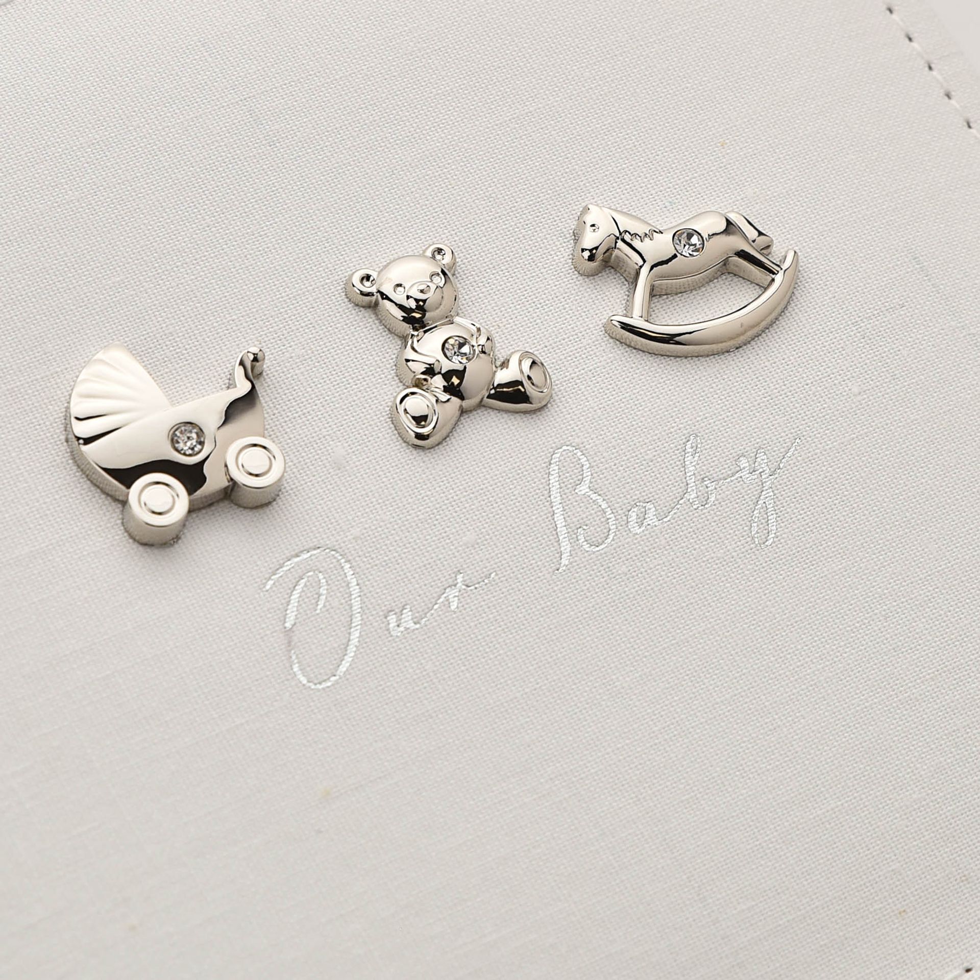 The beautifully white linen cover features a woven finish – embellished with crystal encrusted silver plated teddy bear, pram and rocking horse icons - complete with ‘Our Baby’ decal in silver lettering. Inside is space for one hundred photographs and a personalised front page on which to note details of a new family arrival.