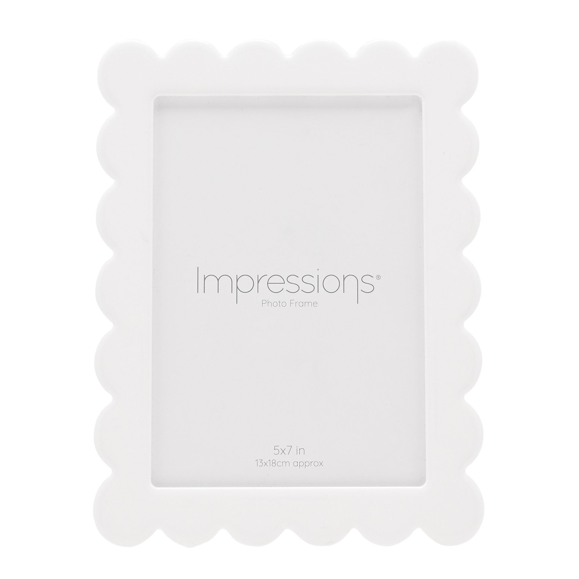 The Impressions Acrylic and Epoxy Photo Frame Flower Shaped Edge in white features a unique scalloped design to showcase 5" x 7" photos beautifully.