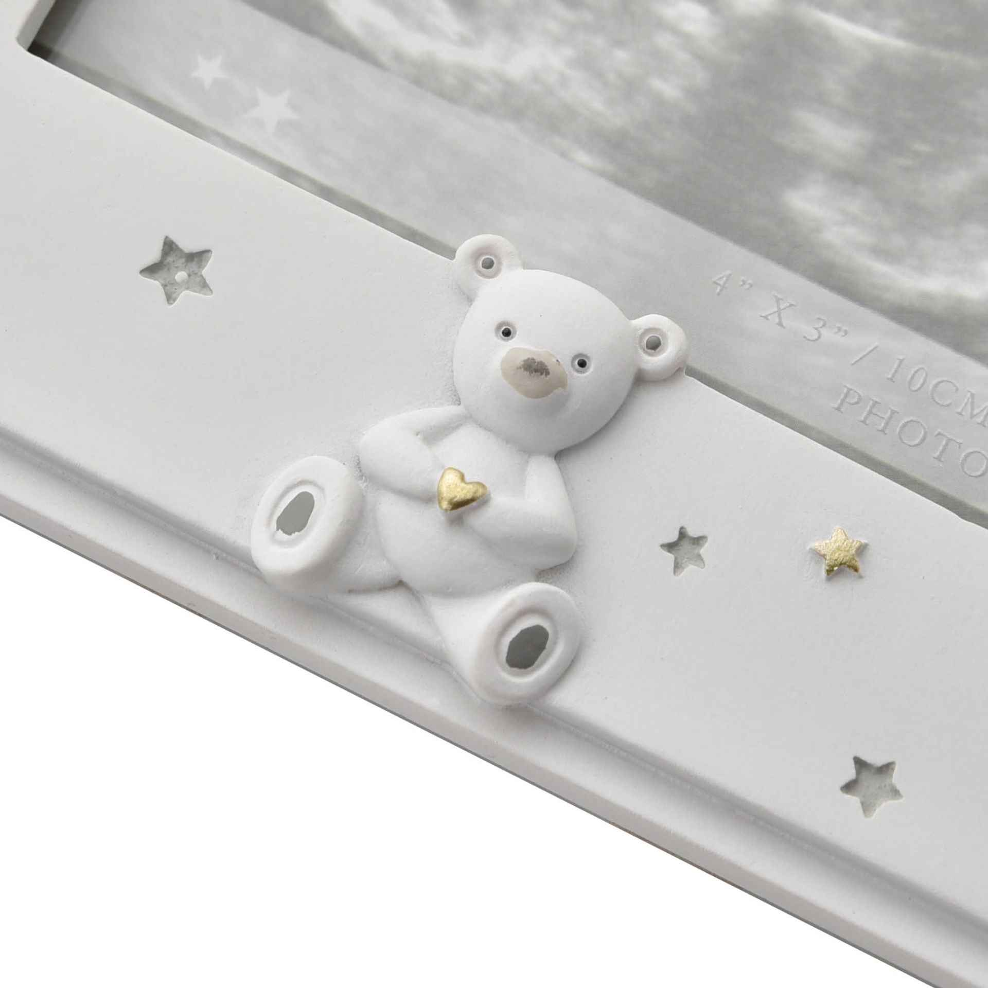 The freestanding, white resin frame features a landscape aperture which is designed specifically for baby scan photos. It is finished with hand painted ‘starry night’ decoration, adorable white teddy bear icon and complementary ‘Baby’s Scan’ decal.