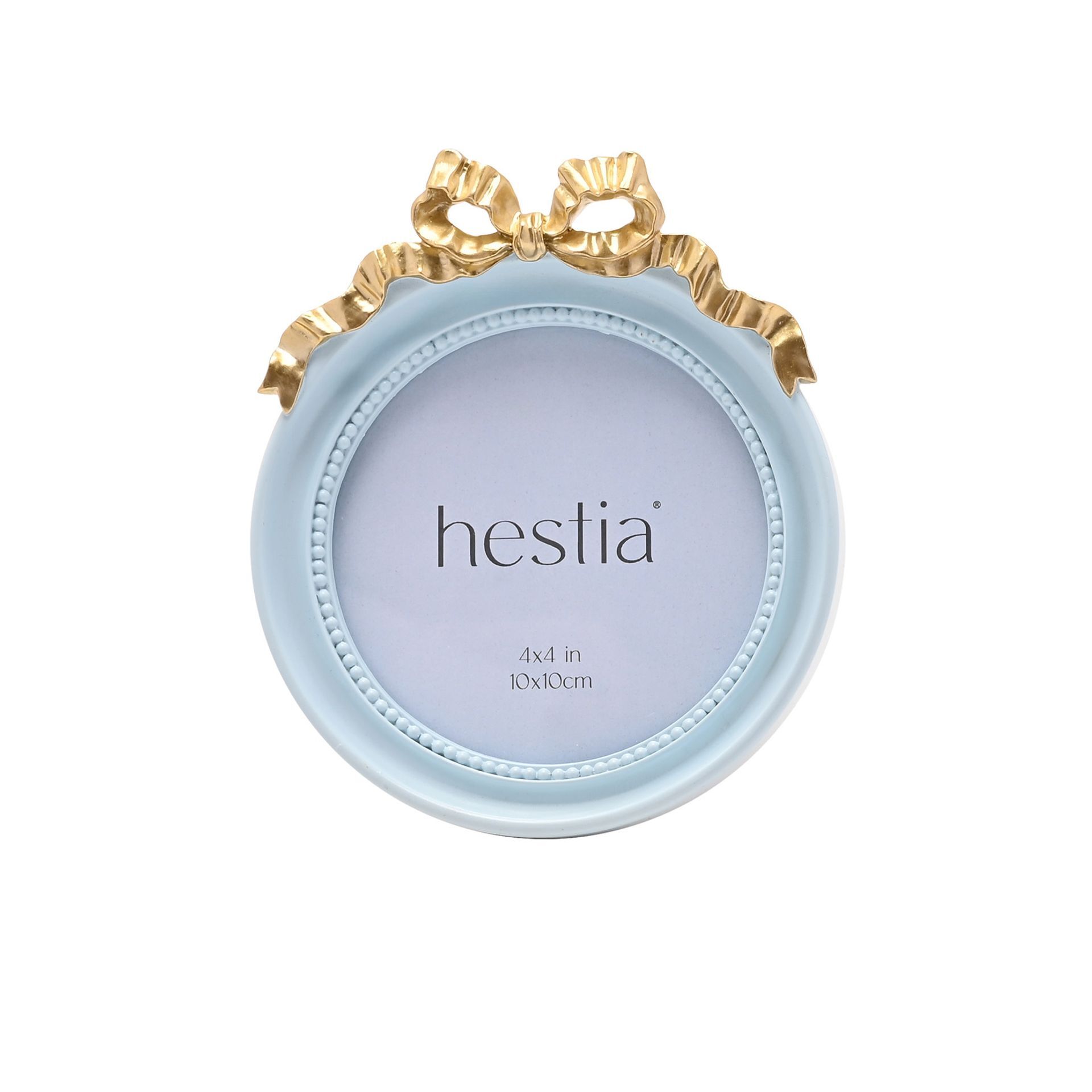 The Hestia Soft Blue with Gold Ribbon Round Photo Frame, with its delicate light blue hue paired with a charming golden bow decoration, exudes elegance. Making it a perfect keepsake or gift.