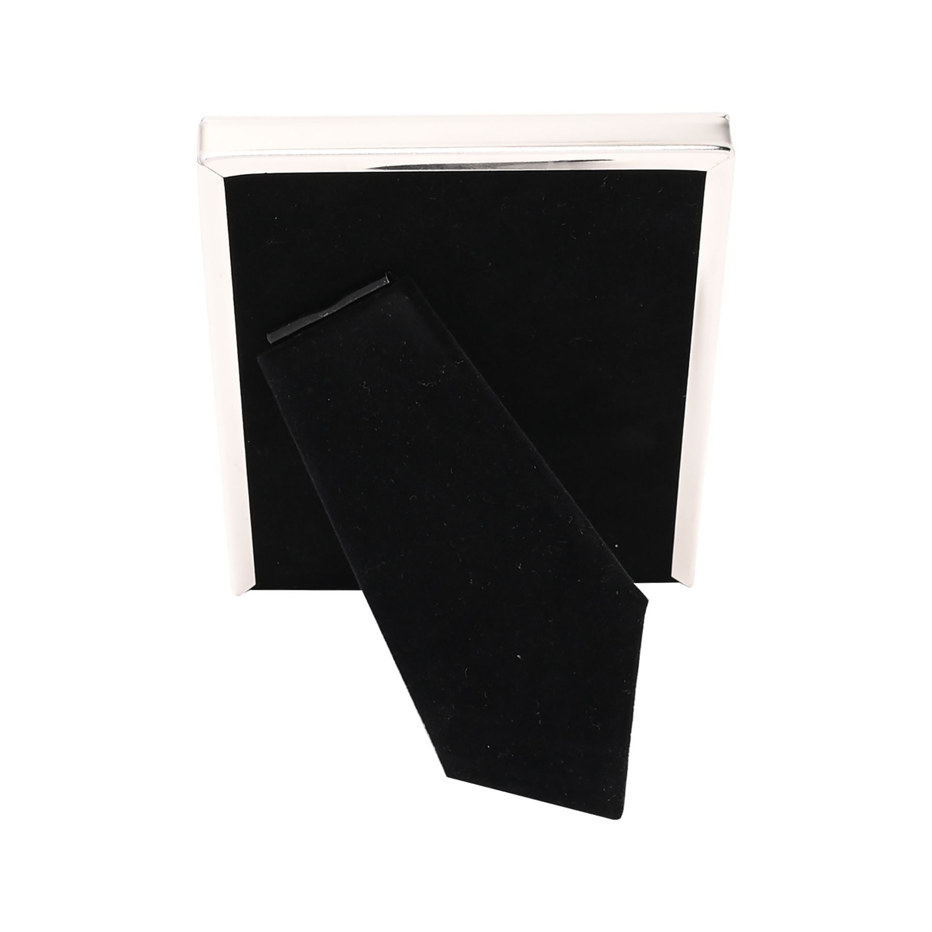The steel frame features a silver and black border around its portrait aperture (3.5” x 5”). Has luxury black velvet backing.