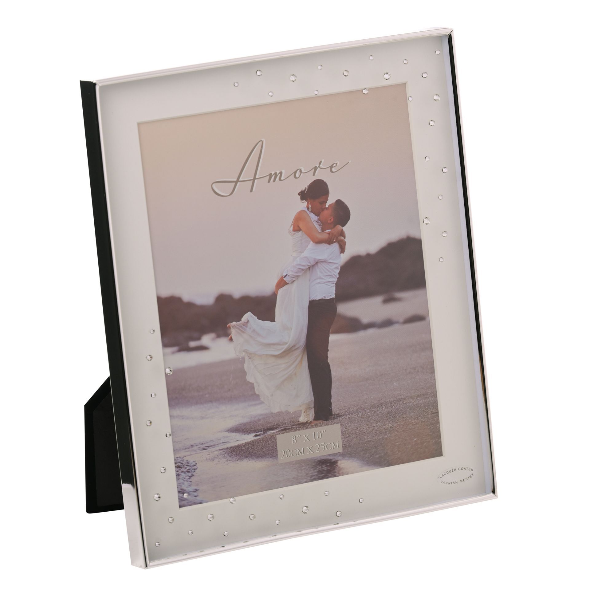 A beautiful silver plated box frame with 8" x 10" (20x25cm) aperture from the AMORE BY JULIANA® Wedding Day Collection. The frame features a crisp white mount and the glass is embellished with a spray of crystals. Complete with standing strut.