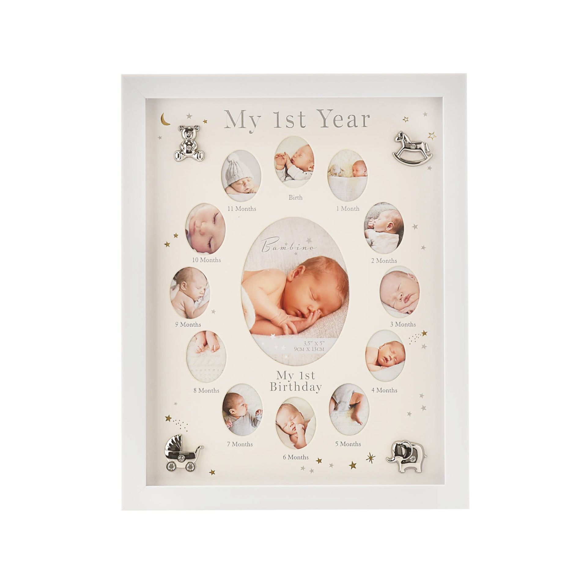 The wooden frame has a white finish, enhanced by solid silver metal decorations and ‘My 1st Year’ decal. It features twelve oval apertures, for collage creation each month, which surround a larger aperture for baby’s first birthday.