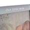 It features a matt blue wooden finish and rectangular aperture, enhanced by silver detailing, including ‘Our Little Man’ sentiment. The rear attachments offer the option of either standing the frame upright or hanging it on the wall.