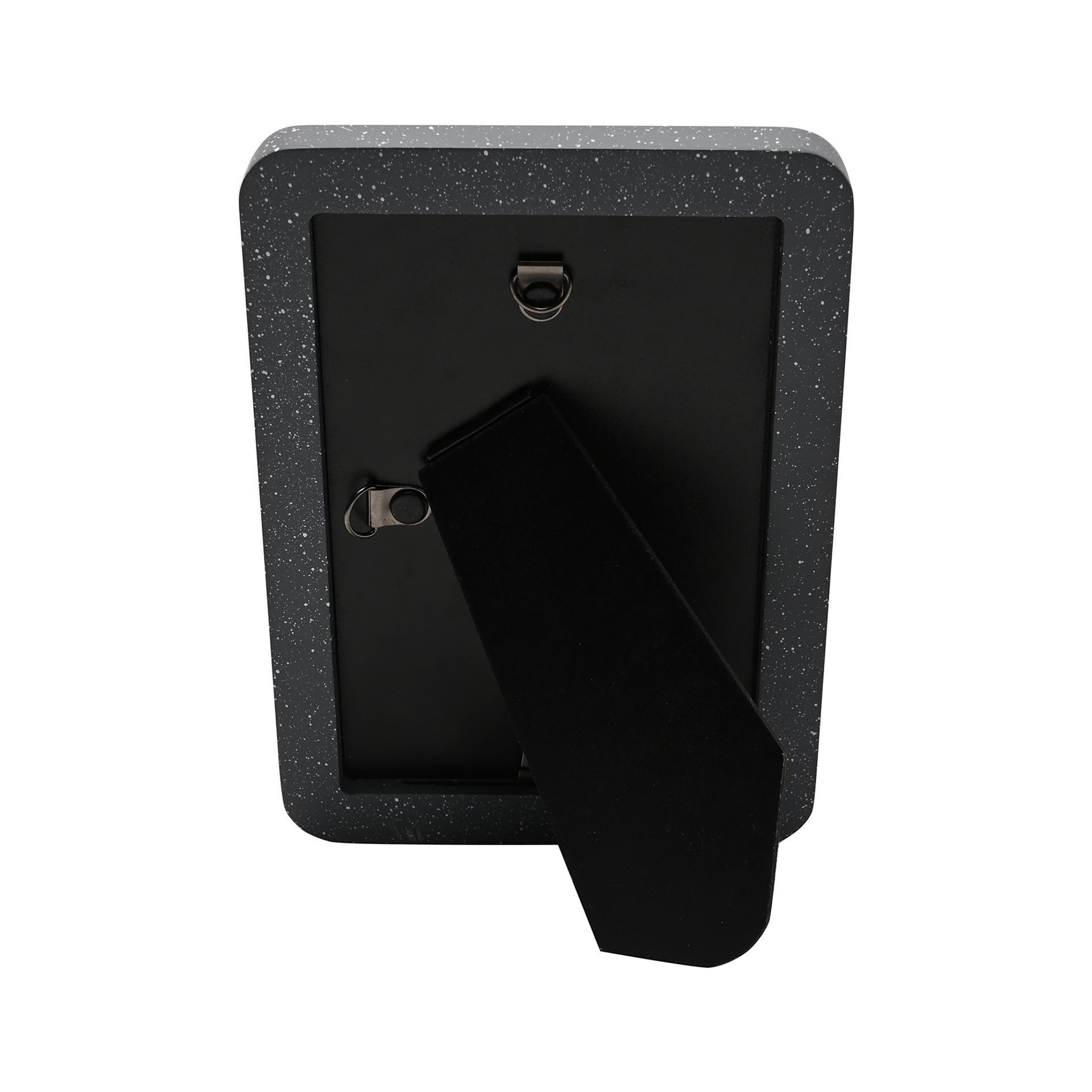 The grey, photo frame showcases a speckled effect to its smooth texture. It is designed for portrait display using the attached standing strut.