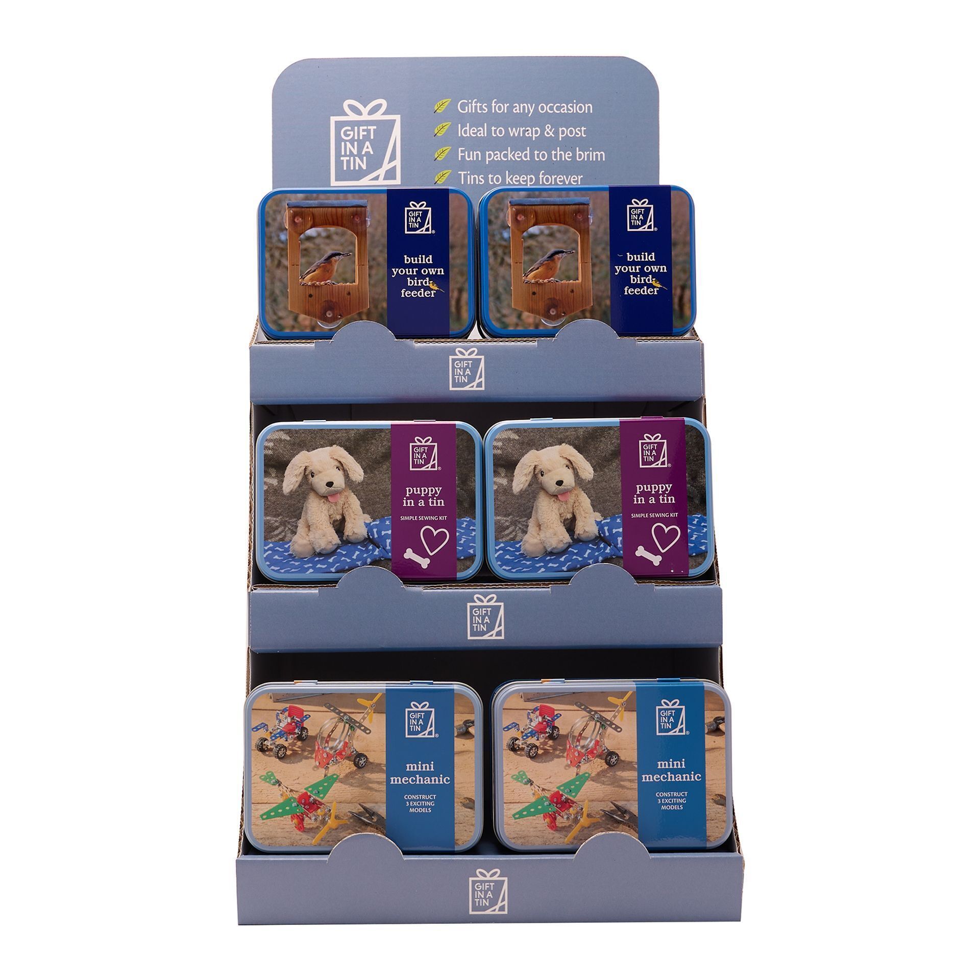 There are many wonderful options to choose from. The cardboard display provides an eye-catching point of sale for the variety of ranges available from Gift in a Tin.