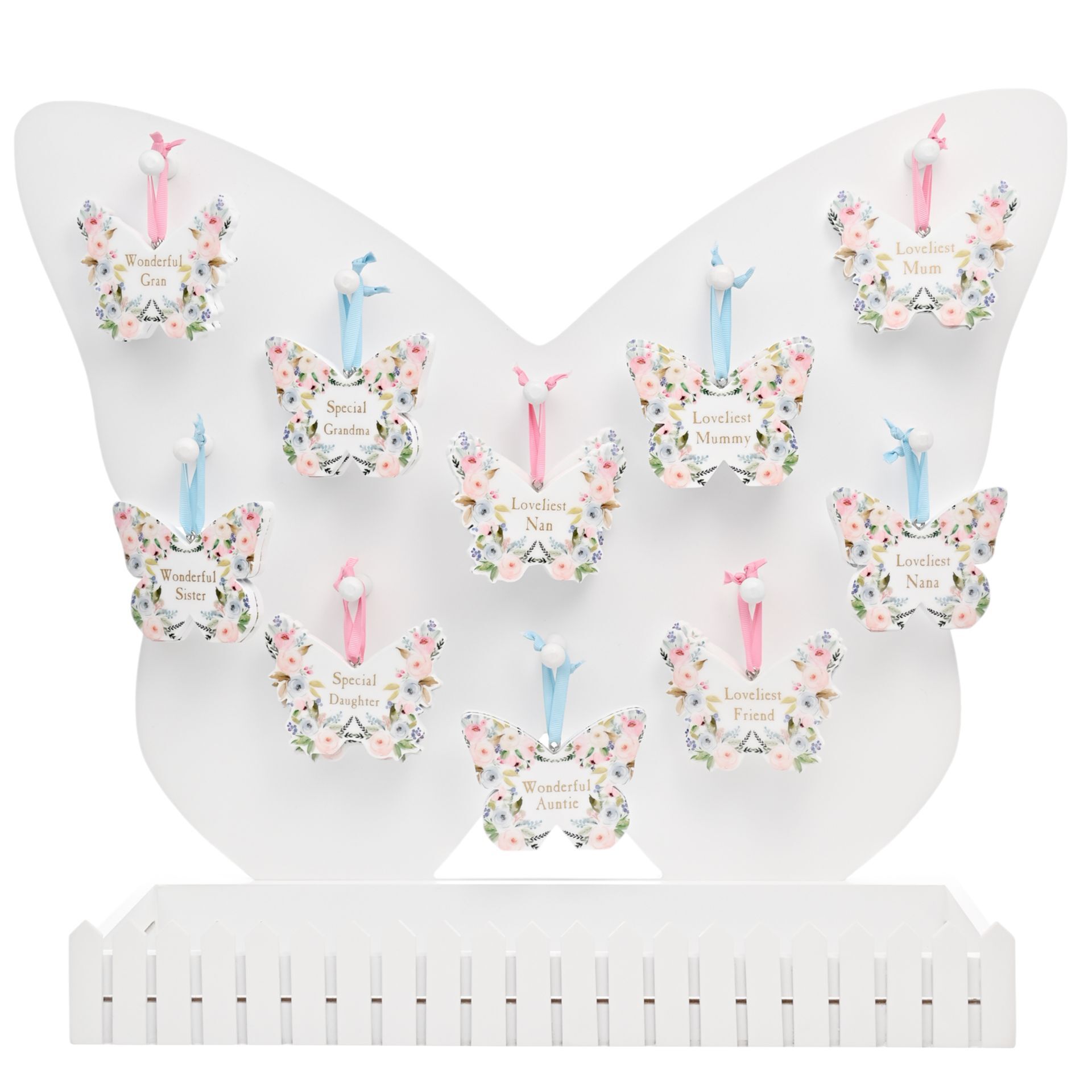 Cute butterfly counter display unit with white picket fence holds 60 ‘Mini Butterfly Hanging Plaques.’ It’s the perfect display solution for your store.