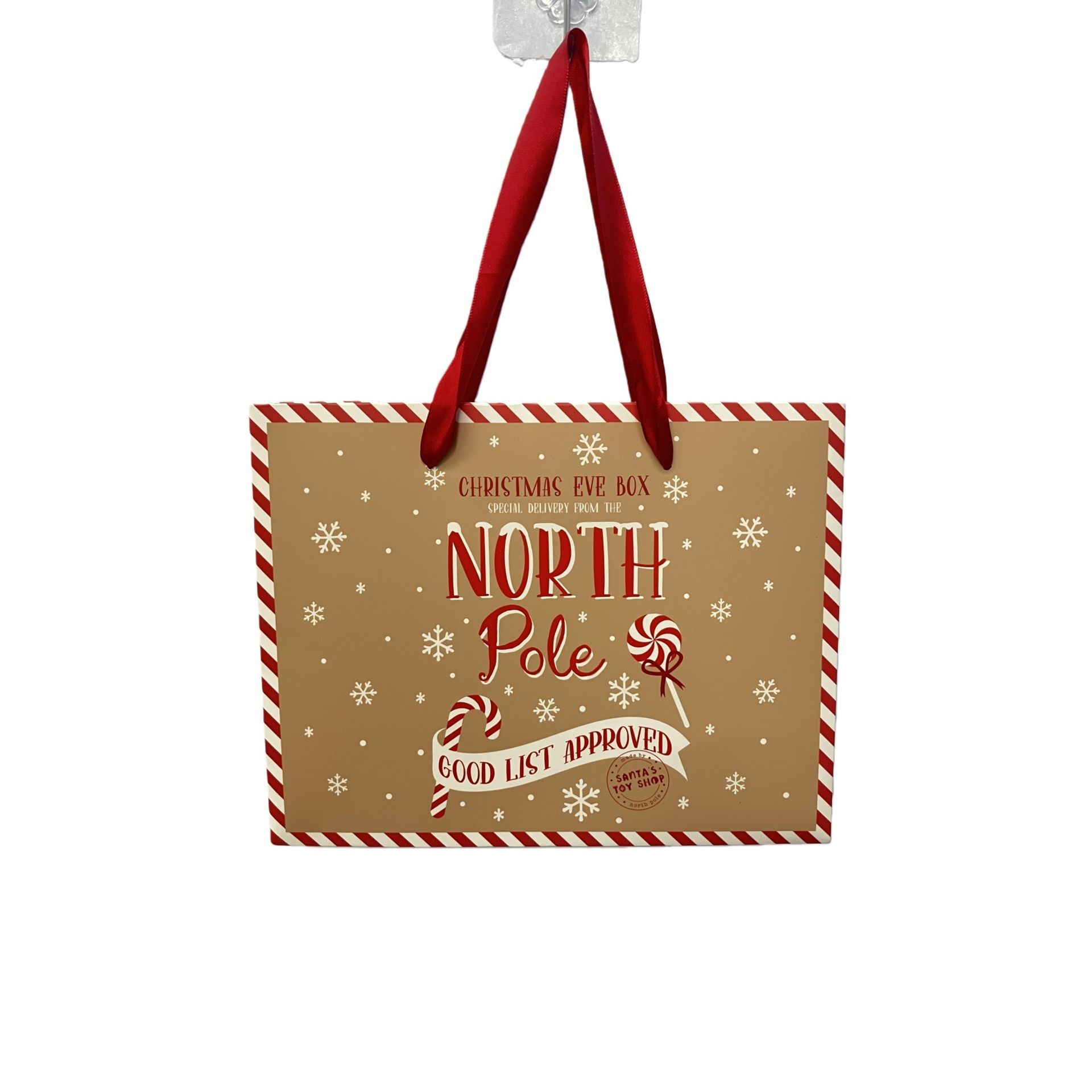 A red and white striped Christmas gift bag features the text "North Pole" and "Good List Approved" in bold print, accented by a sturdy rope handle and shimmering gold foil details.