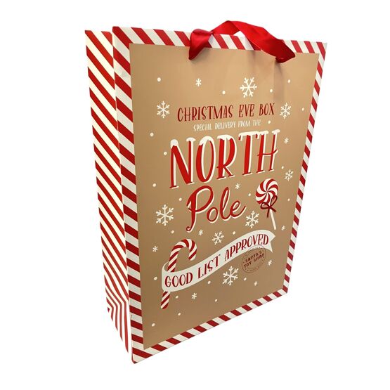 A festive Christmas gift bag with a "North Pole" design, featuring red and white striped patterns, snowflakes, and a candy cane-like embellishment.