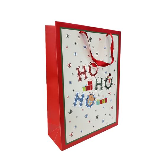 A red and white gift bag with the text "Ho Ho Ho" and various holiday-themed decorations printed on it.