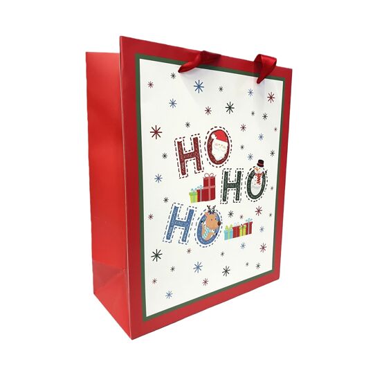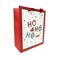 A red and white gift bag with the text "Ho Ho Ho" and various holiday-themed decorations printed on it.