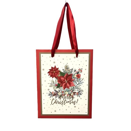 This red and white Christmas-themed gift bag, features a floral design with vibrant poinsettias, pine branches, and the phrase "Merry Christmas!" in gold foil, finished with a sturdy rope handle and scattered star accents.