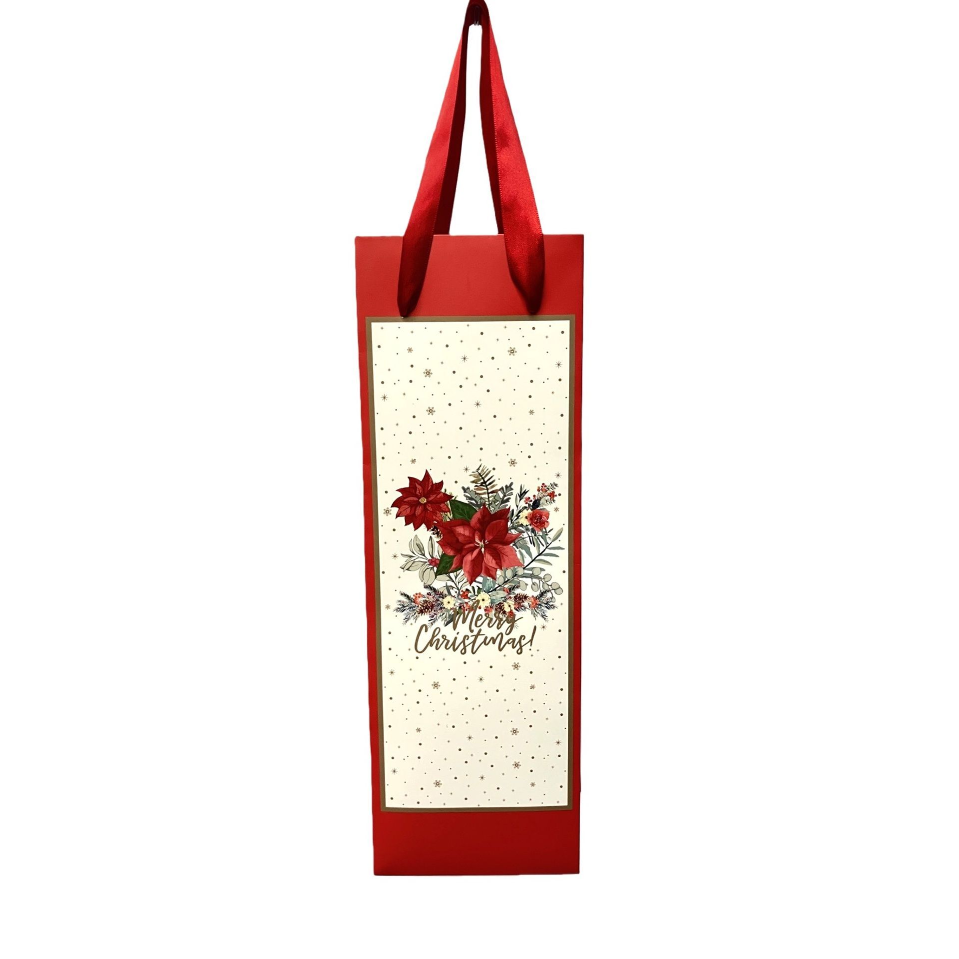 This red and white Christmas-themed gift bag, features a floral design with vibrant poinsettias, pine branches, and the phrase "Merry Christmas!" in gold foil, finished with a sturdy rope handle and scattered star accents.
