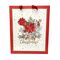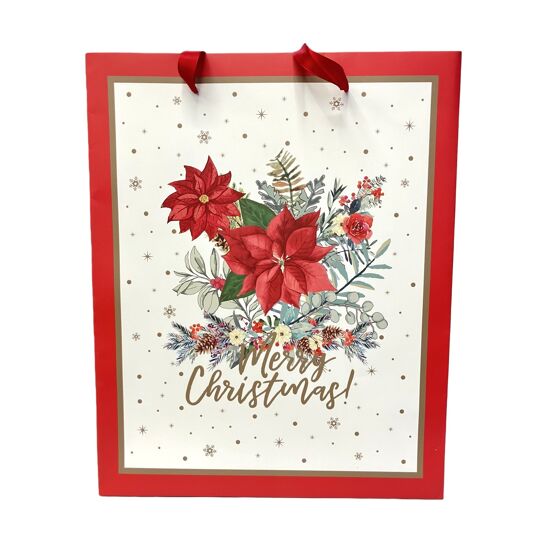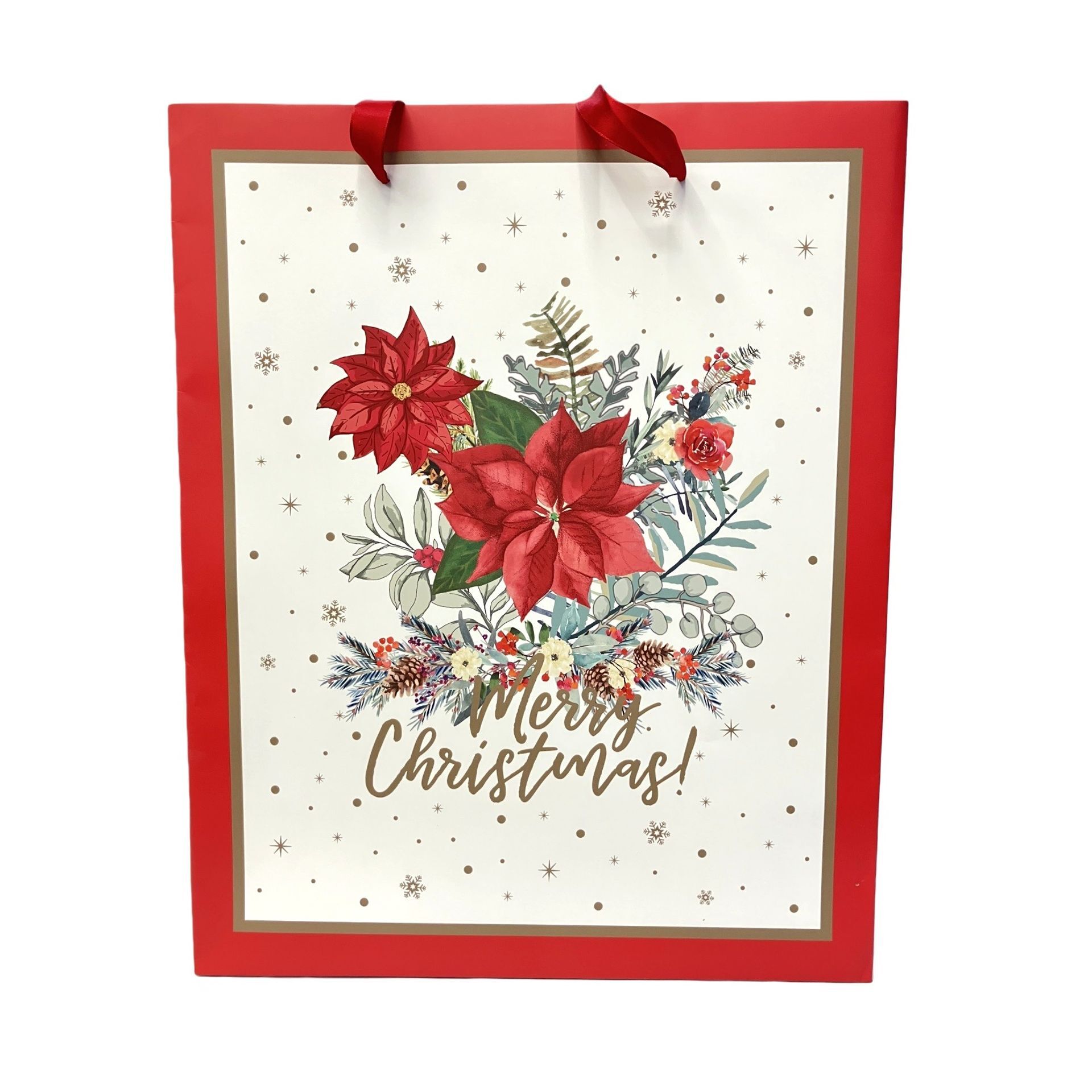 This red and white Christmas-themed gift bag, features a floral design with vibrant poinsettias, pine branches, and the phrase "Merry Christmas!" in gold foil, finished with a sturdy rope handle and scattered star accents.