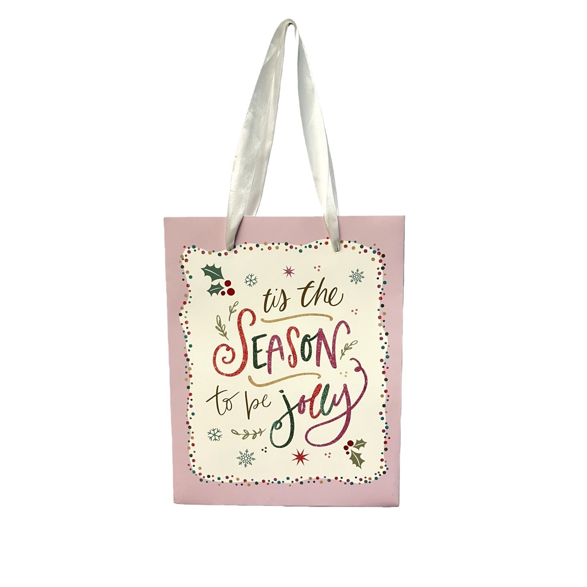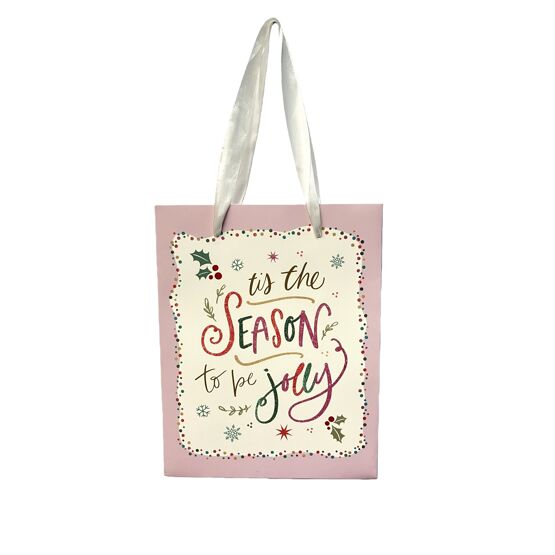 The MULTI 12 "Tis The Season" gift bag with ribbon handle and gold foil - is a festive gift bag designed for seasonal celebrations. A pink gift bag with the text "Tis the season to be jolly" written on it, decorated with holly leaves, berries, and snowflakes.