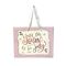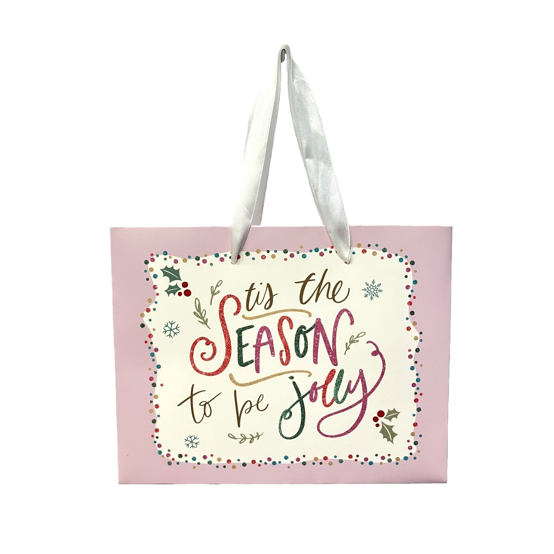 The MULTI 12 "Tis The Season" gift bag with ribbon handle and gold foil - is a festive gift bag designed for seasonal celebrations. A pink gift bag with the text "Tis the season to be jolly" written on it, decorated with holly leaves, berries, and snowflakes.