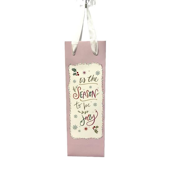 The MULTI 12 "Tis The Season" gift bag with ribbon handle and gold foil - is a festive gift bag designed for seasonal celebrations. A pink gift bag with the text "Tis the season to be jolly" written on it, decorated with holly leaves, berries, and snowflakes.