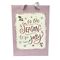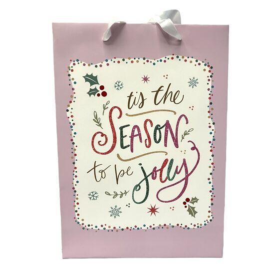 The MULTI 12 "Tis The Season" gift bag with ribbon handle and gold foil - is a festive gift bag designed for seasonal celebrations. A pink gift bag with the text "Tis the season to be jolly" written on it, decorated with holly leaves, berries, and snowflakes.