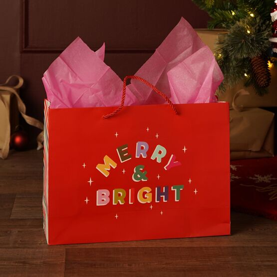 A bold red gift bag features the cheerful text "Merry & Bright," finished with a whimsical pink tissue paper. A perfect pair for this gifting season.