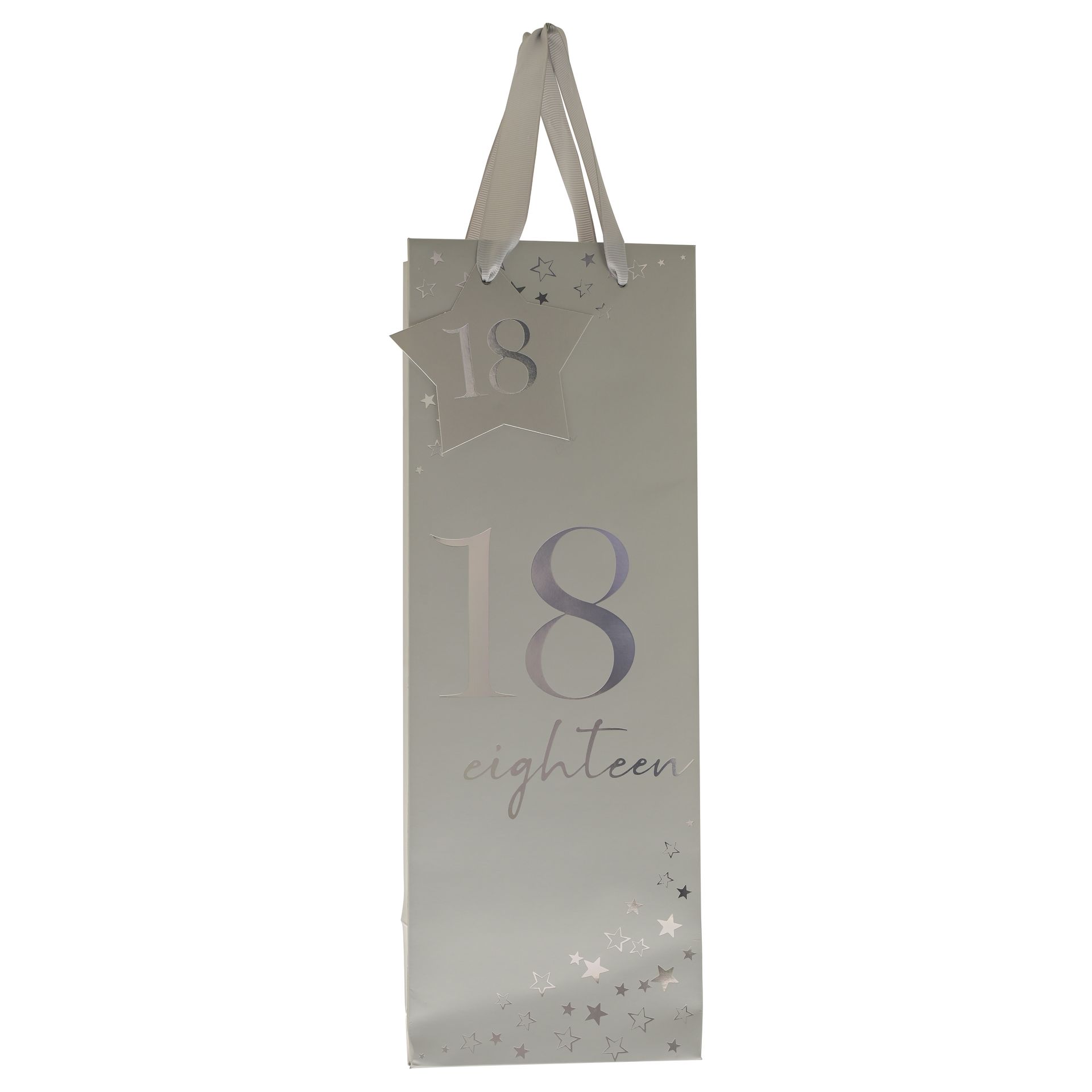 The gift bags showcase a bold silver star design on both sides, complete with matching ’18 - Eighteen’ title, internal decoration, ‘18’ gift tag and silver-grey ribbon handle. They are made from recycled and responsibly soured paper.