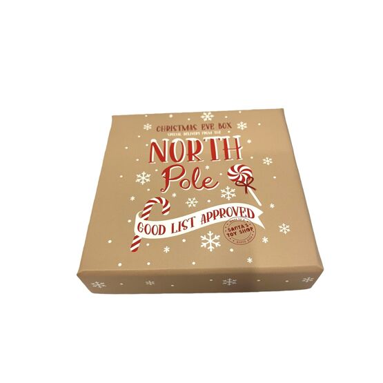Crafted from brown cardboard, each box features the text "NORTH POLE GOOD LIST APPROVED" in shimmering hot foil, accented by printed snowflakes and candy canes for a playful seasonal touch.