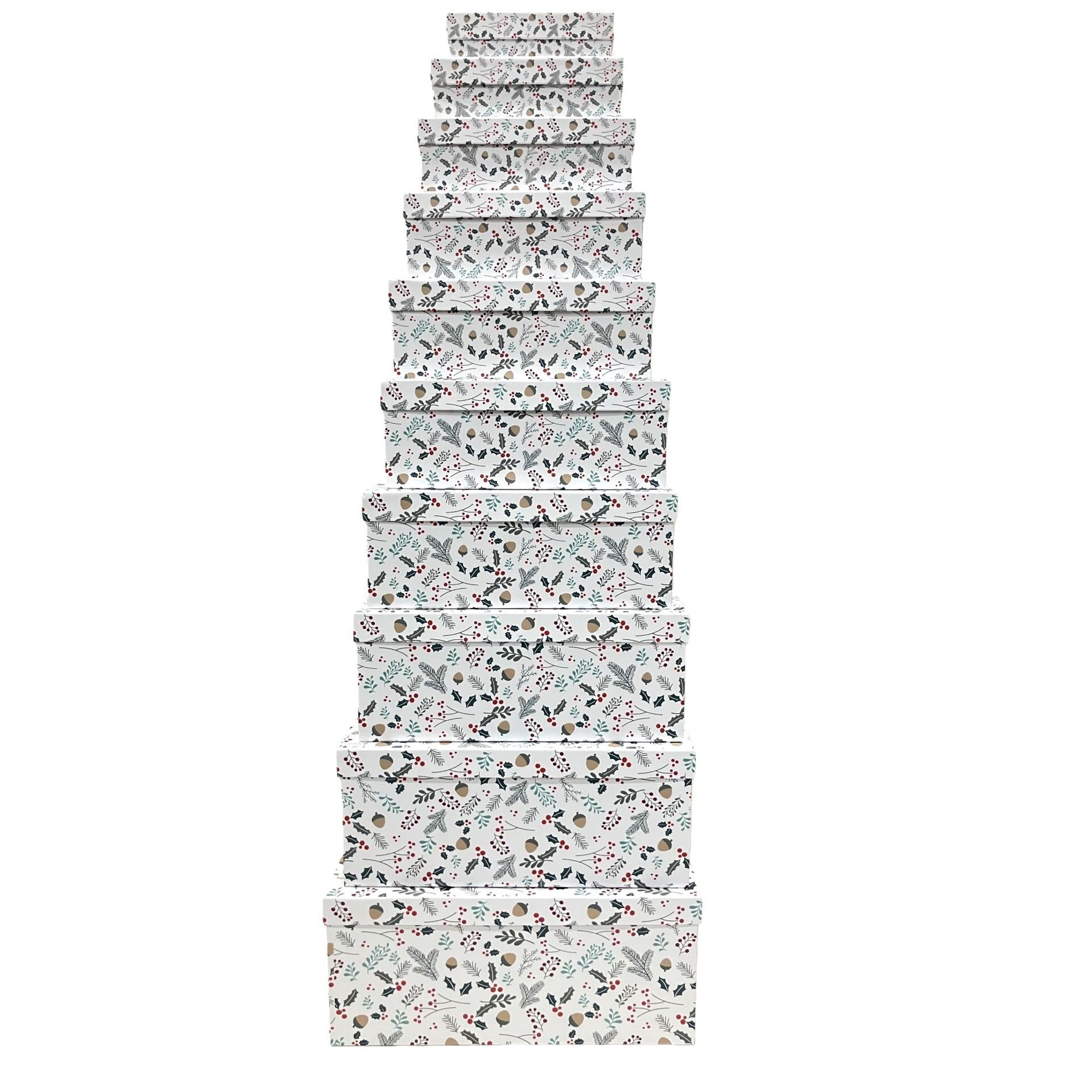 Set of 10 Merry Christmas Foliage Paper Boxes with Hot Foil Lid - Largest Size:40x29x18cm