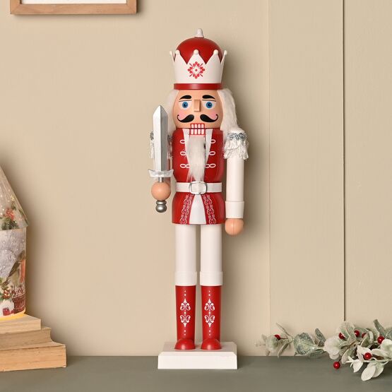 This wooden nutcracker soldier stands tall in a red and white uniform, holding a sword and poised on a crisp white base. The moving mouth adds interactive appeal, while musical features powered by 3 x AAA batteries (not included) or usb wire offer a modern twist.