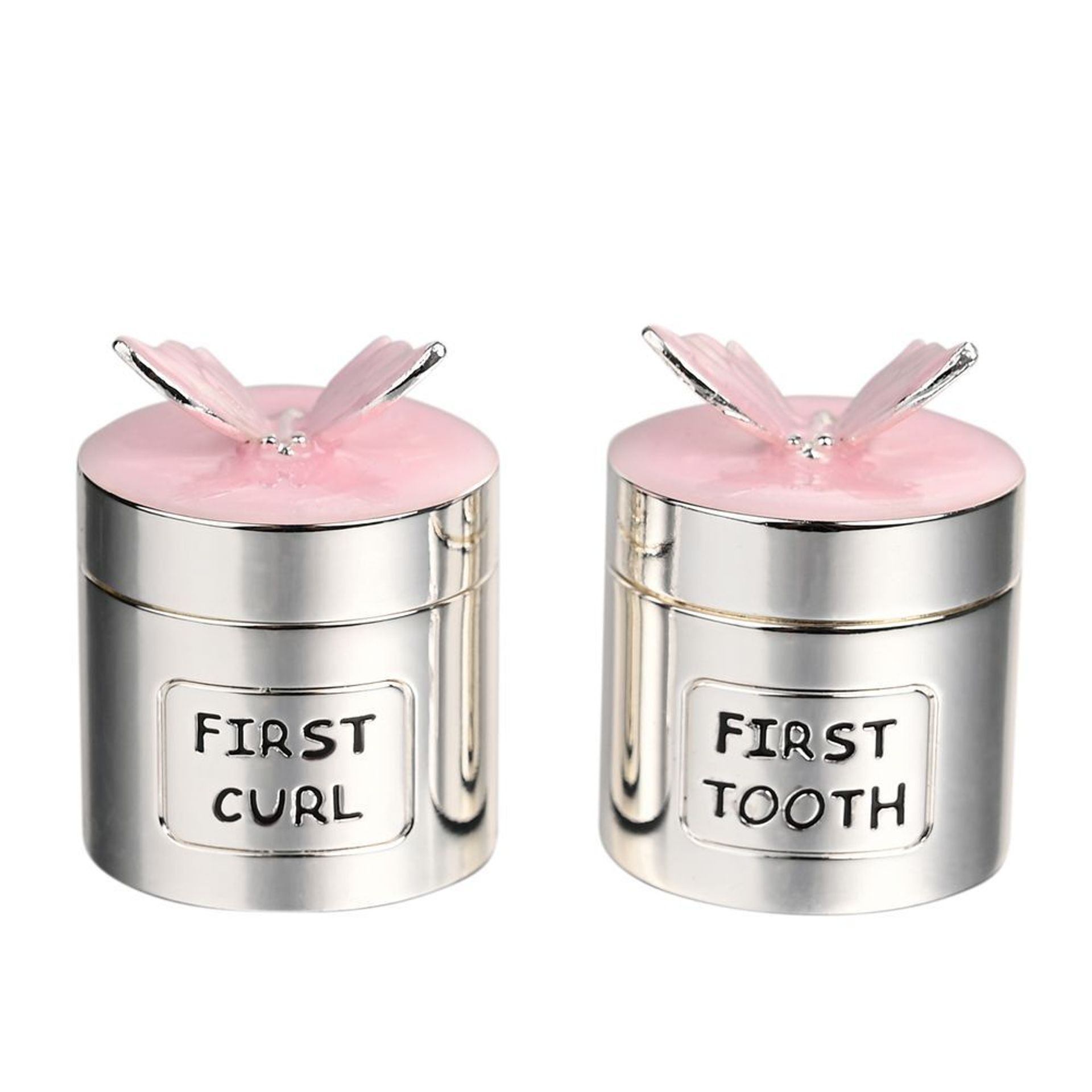 Crafted with meticulous attention to detail, the set features delightful butterfly embellishments adorning the lids of both containers. One piece is elegantly inscribed with the words 'First Tooth,' while the other proudly displays 'First Curl,' capturing the significance of these cherished milestones in your child's life.