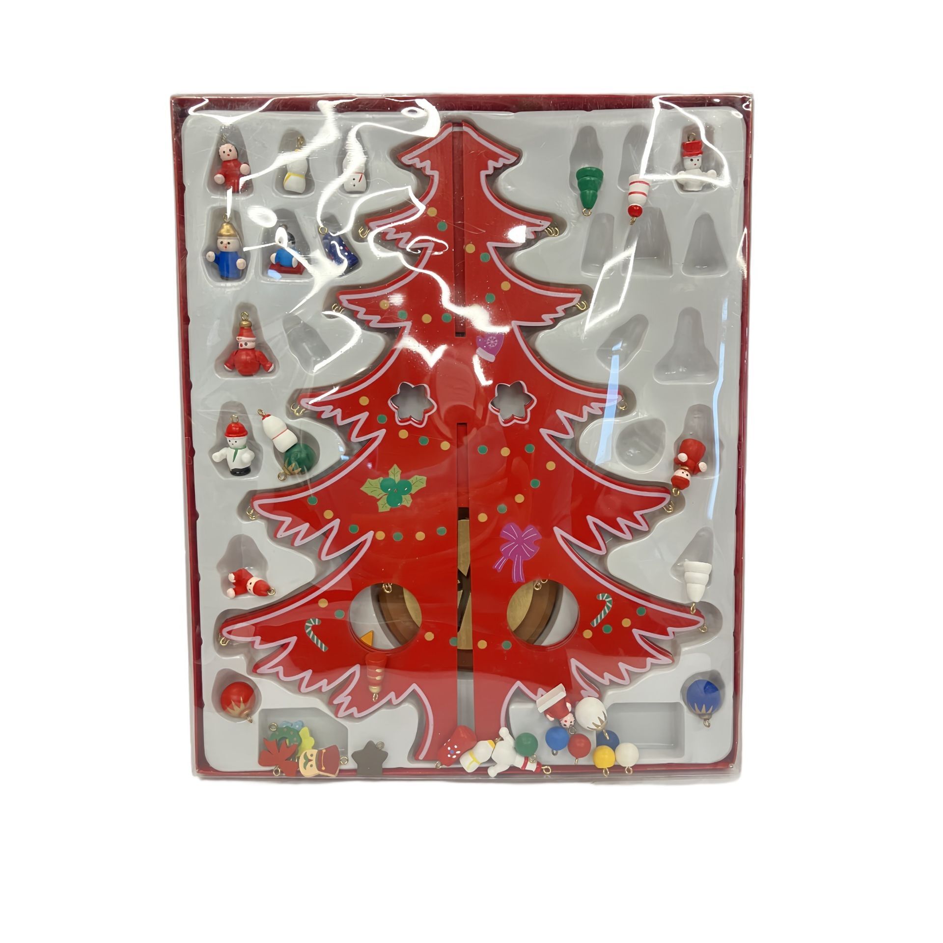 A vibrant red Christmas tree-shaped decoration is adorned with an array of colourful ornaments and cheerful shapes, inviting creativity and hands-on fun. The bold palette and modern silhouette bring a fresh twist to classic Christmas decor.