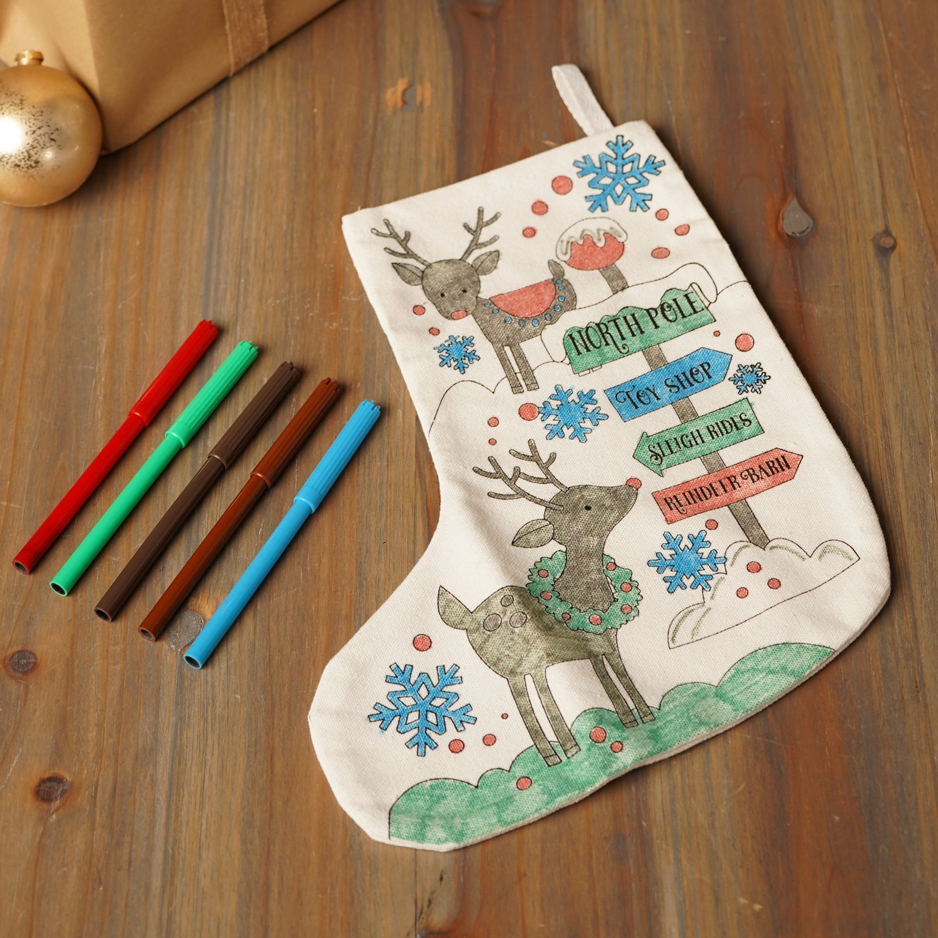 A canvas stocking featuring a winter scene with a reindeer and snowflakes, along with markers for colouring the image. The set includes five watercolour pens, encouraging children to personalise their own Christmas decor.