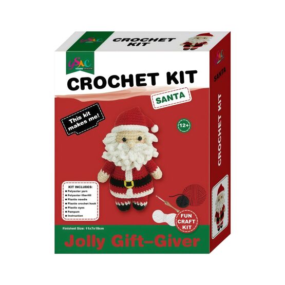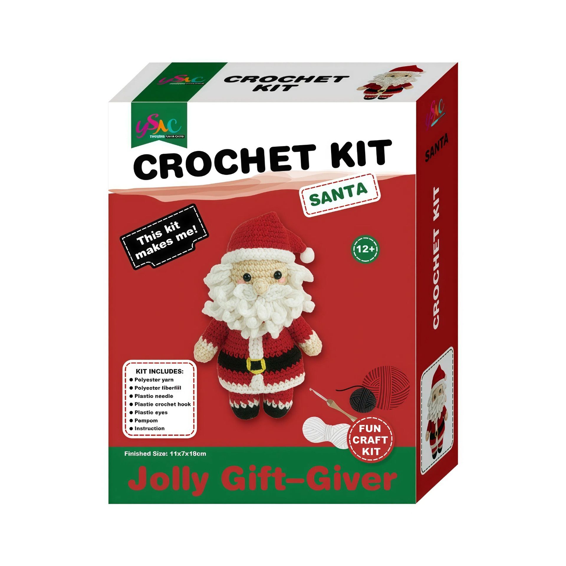 The box includes a crochet kit for making a Santa with various crochet supplies inside the box.