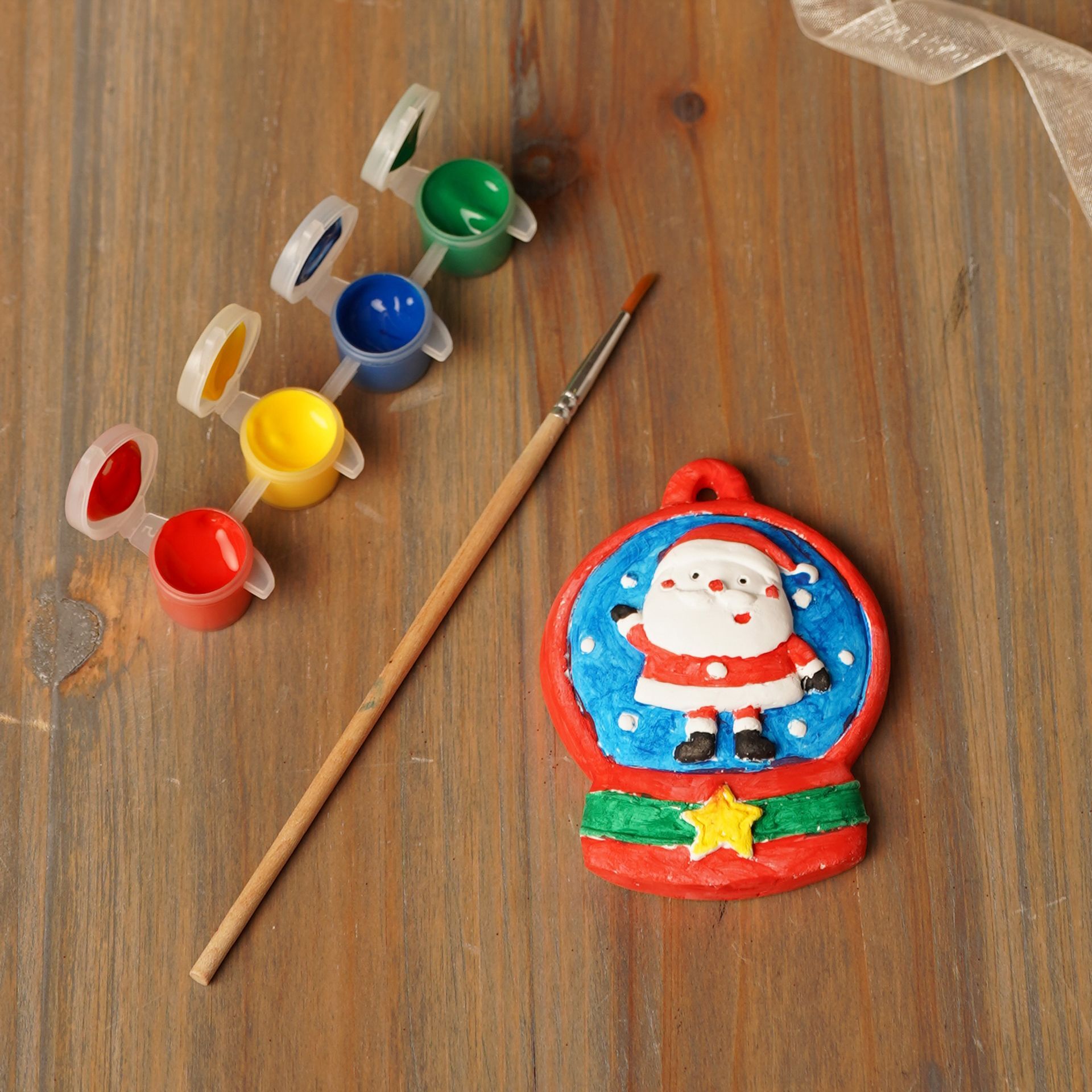 Featuring a selection of paint pots in assorted colours, a fine paintbrush, and a charming Santa Claus ornament, it offers a hands-on way to personalise Christmas decor.