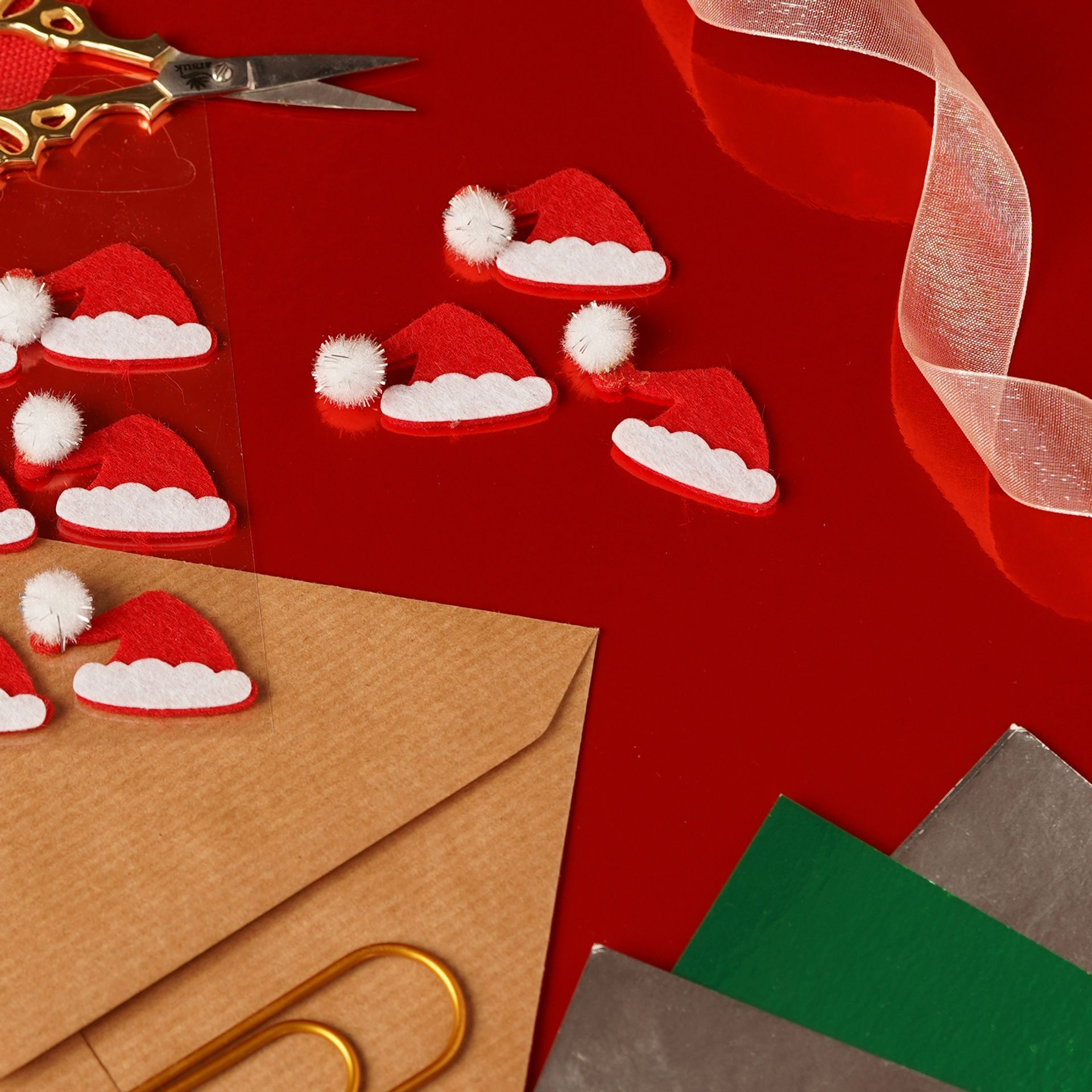 12 small red and white Santa Claus hats stickers, perfect for Christmas crafting stickers. Each sticker features a bold red hat with a white trim and fluffy pom-pom, capturing the cheerful spirit of Santa in a fun, dimensional form.