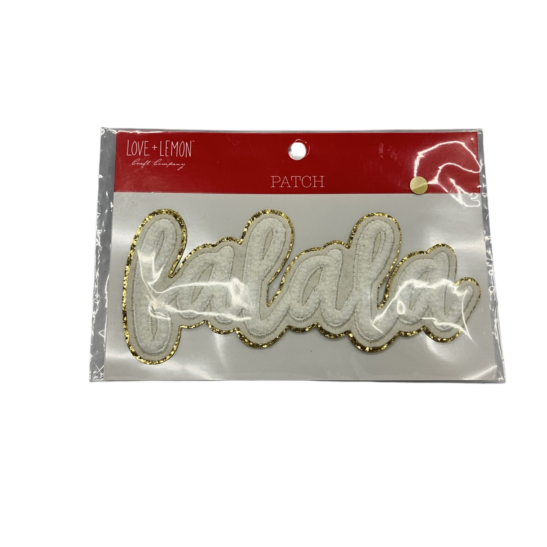 This "FA LA LA" white and gold patch add's a touch of humour and sparkle to stockings, gift wrap, or seasonal accessories.