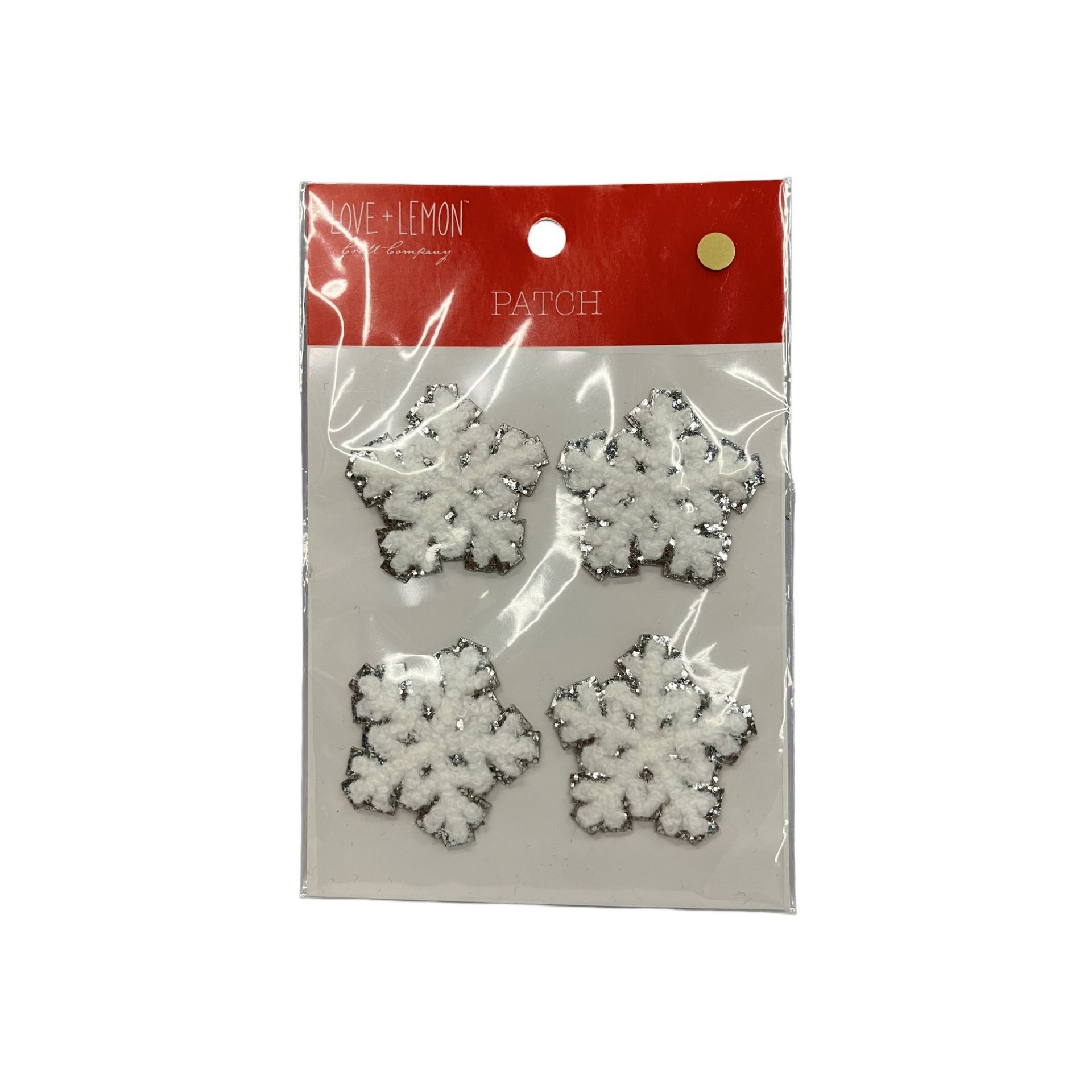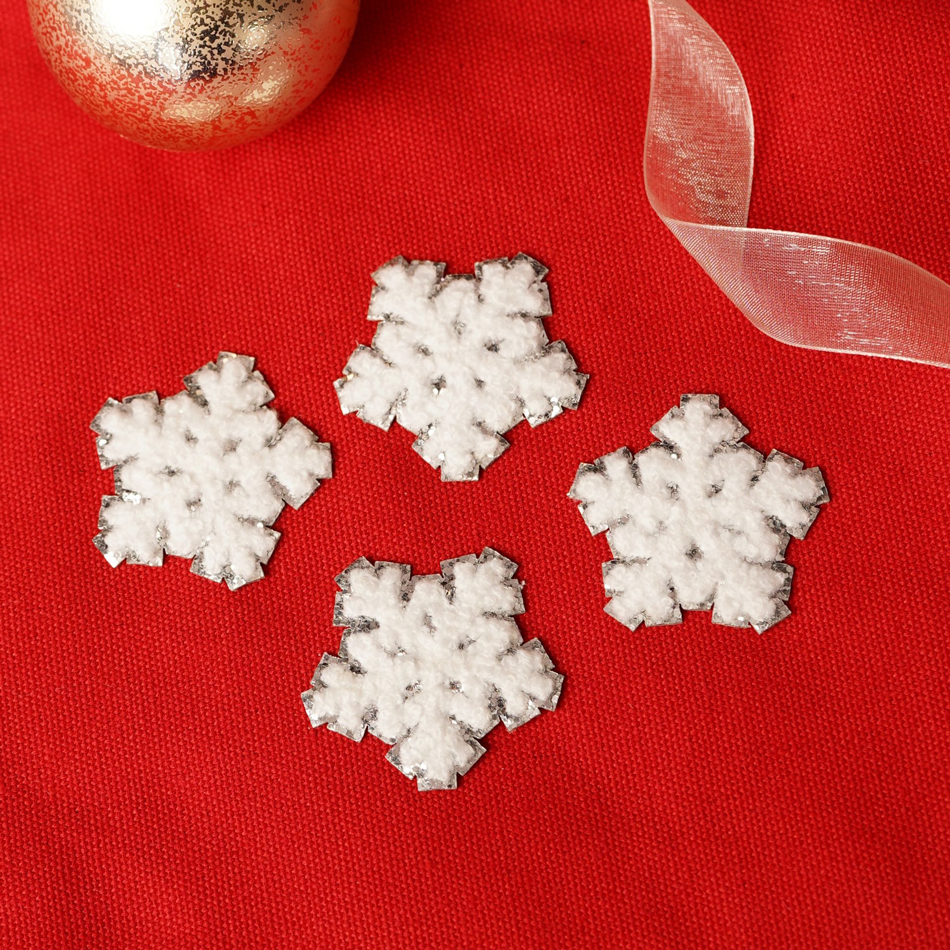 Each patch features a crisp white snowflake design, crafted to stand out with clean lines and a tactile finish. The set arrives in a package of four, perfect for adding a touch of seasonal charm to gifts, stockings, or creative projects.