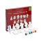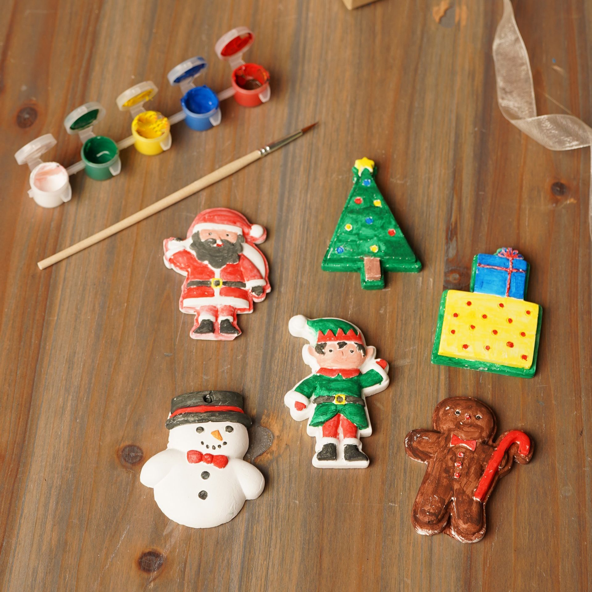 The image shows Christmas-themed decorations and craft supplies, including a Santa Claus figure, Christmas tree, snowman, and gingerbread man, arranged on a wooden surface with paint brushes and colourful paints.