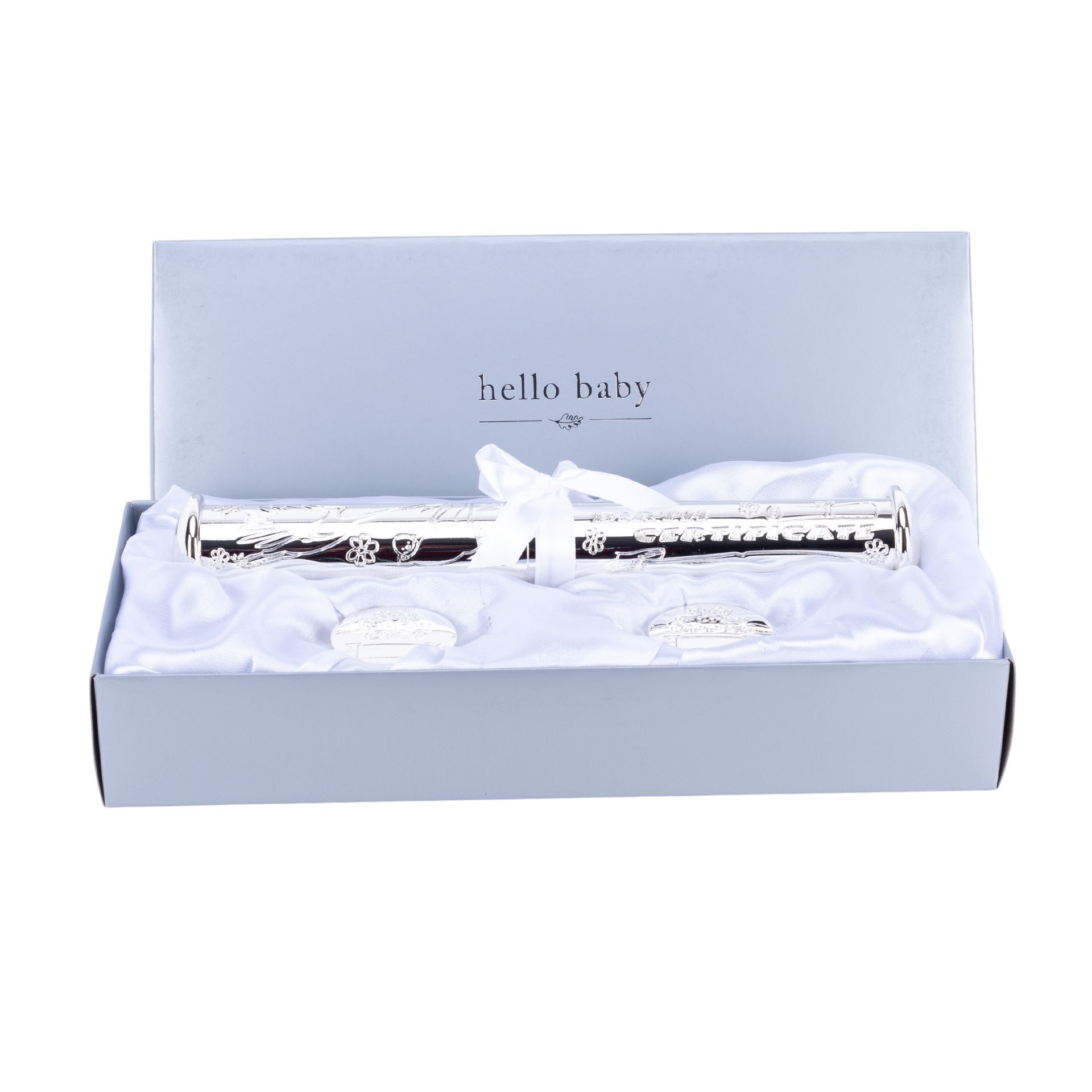The keepsake boxes can be personalised with an engraving across the banner on the lid of the box making this a truly unique gift to give. Open up each keepsake box to reveal a gorgeous velour interior designed to be kept safe for many years. The tube is embellished with adorable engravings with space for engraving personal data and twists to open from the centre.