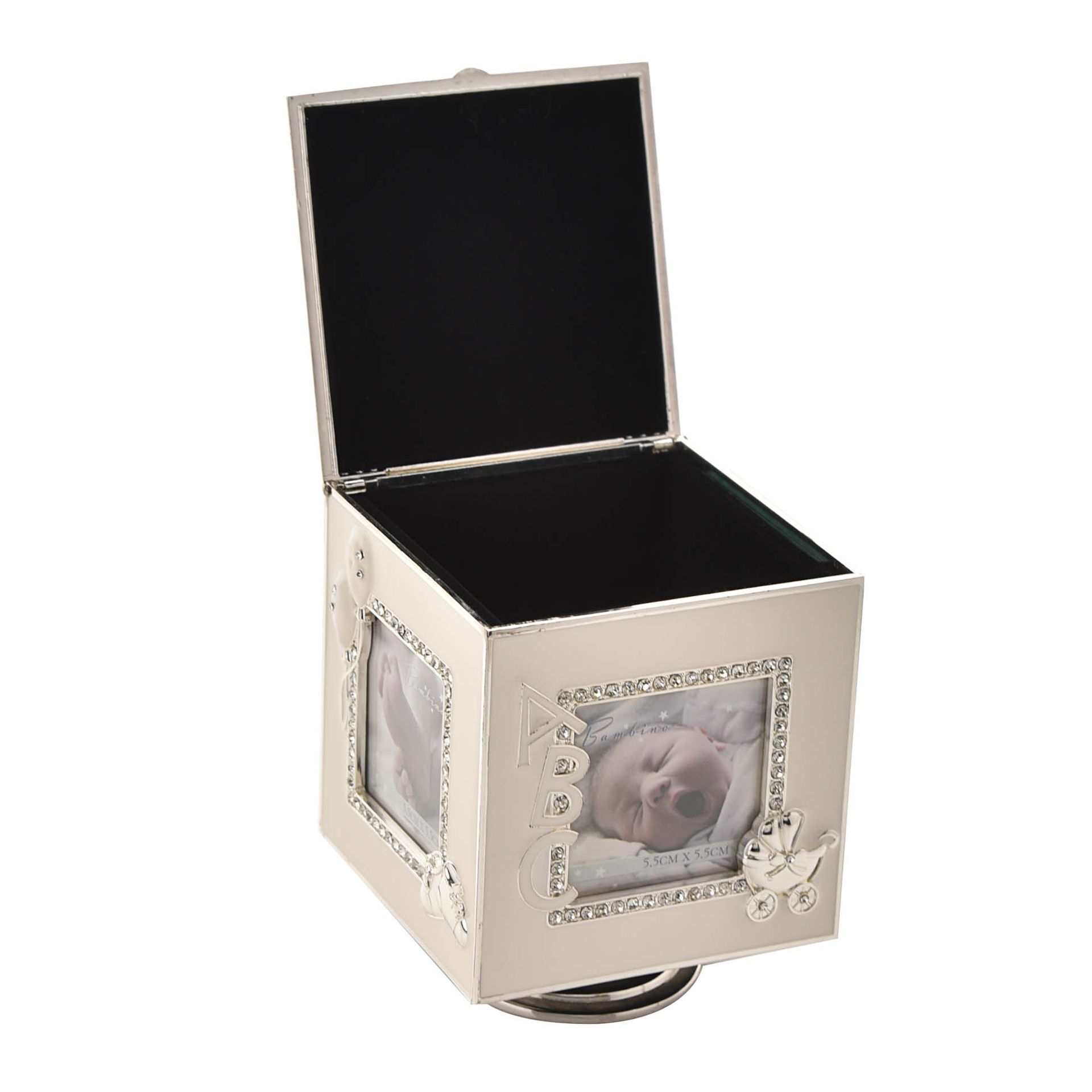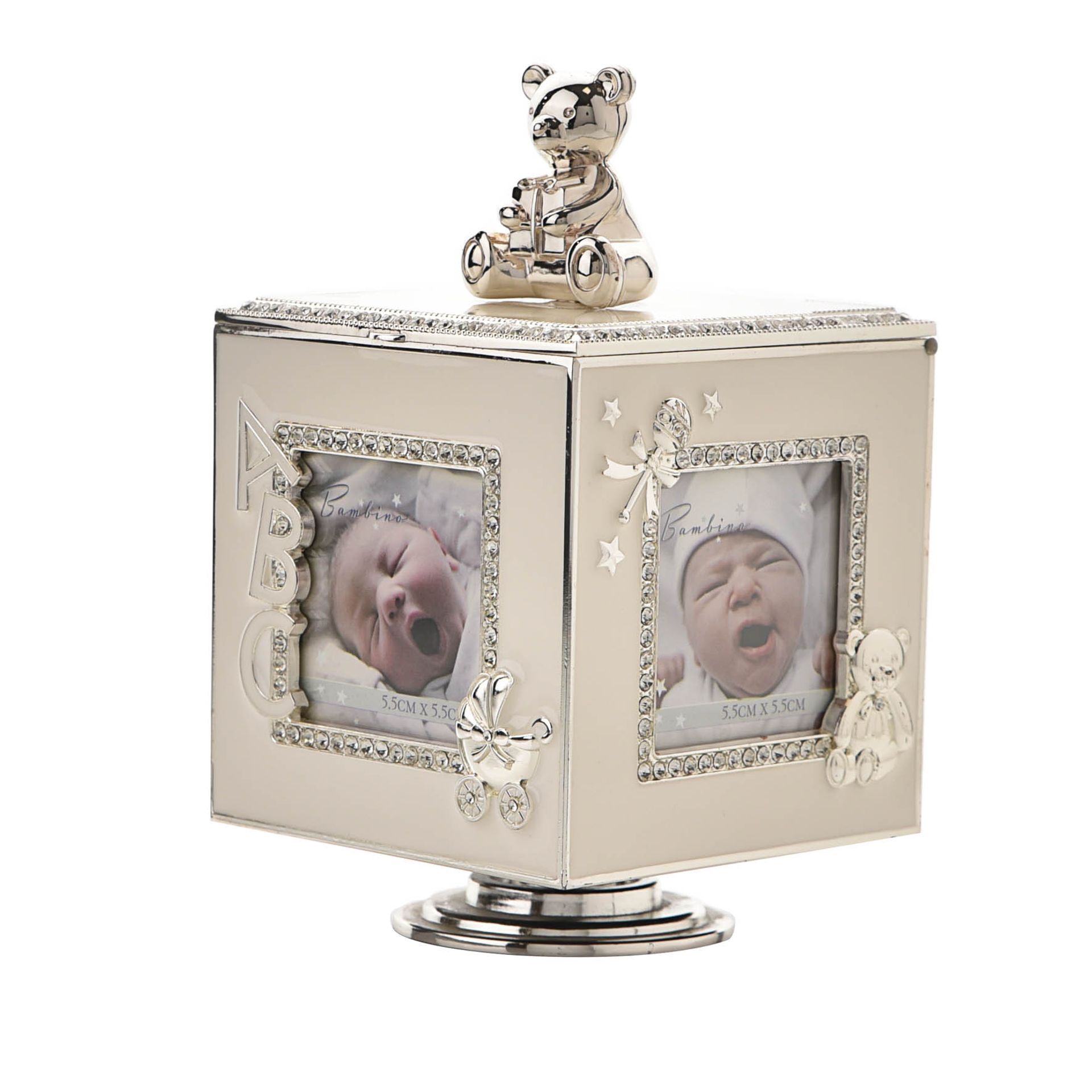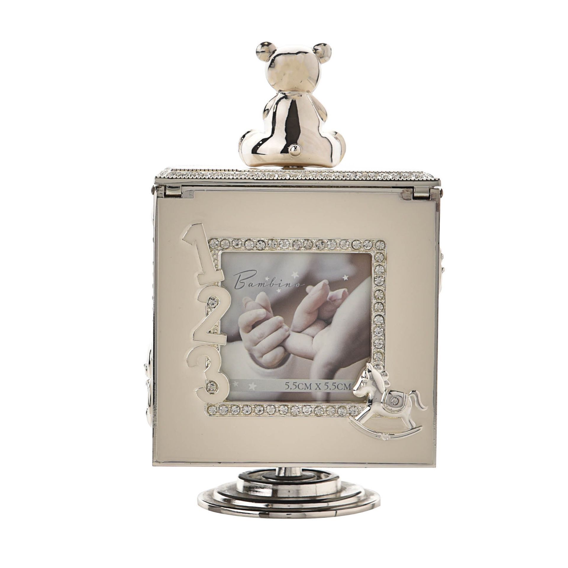 A silver plated rotating photo frame music box from BAMBINO BY JULIANA®.